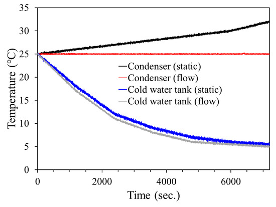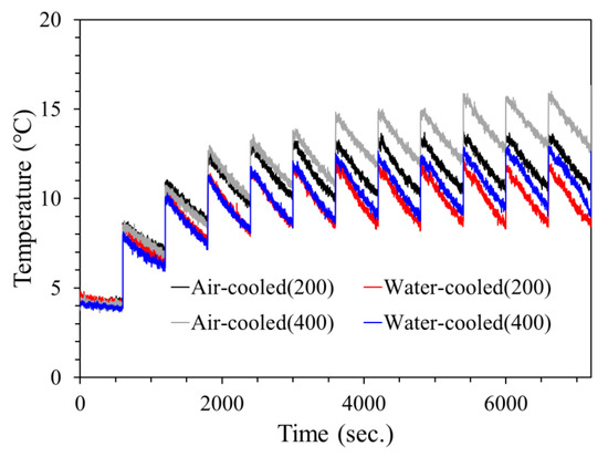 Figure 9 shows the evolution of the tank water temperature under continuous water supply conditions. Both water-cooled and air-cooled condensers have a tank water temperature of approximately 4 °C when pull-down is complete. The numbers in parentheses in the legend indicate the water supply capacity. A certain amount of water is discharged every 30 min, and the corresponding amount is replaced with 25 °C water, immediately increasing the water temperature inside the tank. As the tank water temperature rises and the cooling system begins operating, the water-cooled condenser exhibits a rapid temperature drop due to its superior cooling performance. When 200 mL of water is supplied, after approximately six water supply and drain cycles, the air-cooled condenser maintained a temperature above 10 °C, while the water-cooled condenser maintained a temperature below 10 °C.