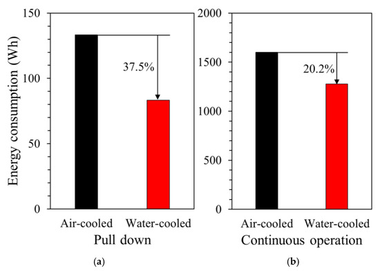 Energy consumption of air-cooled and water-cooled condenser systems under two operation modes: (a) pull-down and (b) 24 h continuous operation.