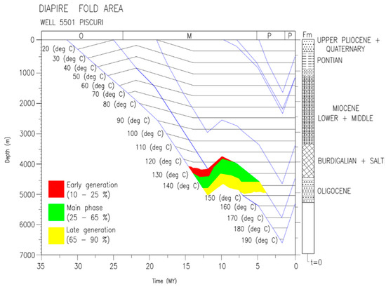 (1) Background: This research examines the study of crude oil generation mechanisms in the Diapir Fold Area (exaggerated diapirism alignment) through two representative cases. The geology of the respective area, along with the tectonics and the formation conditions of the hydrocarbons, is presented. (2) Methods: Based on the research of the international study and local research study, the authors simulated two sediment burial models (from the previously mentioned area), suggesting the hydrocarbon generation conditions and tracing the sediment burial curves. (3) Results: Based on these, the depths, the geological ages of the formations generating hydrocarbons, and the time in millions of years were established. (4) Conclusions: A mathematical model based on Artificial Intelligence is presented to resolve an oil generation in a diapirism area.