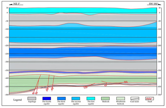 Wobei mine is a fully concealed deposit under the extra-thick loose layers of the Neoproterozoic and Quaternary systems. Based on the characteristics of the media in which they are hosted, aquifers can be classified as Cenozoic aquifers, Permian sandstone fissured aquifers, Carboniferous karst fissure aquifers, and Ordovician limestone karst fissured aquifers. The thickness of the loose layer is controlled by ancient topography, generally increasing from east to west, with a range of 378.80–445.40 m and an average of 404.50 m. Based on the characteristics of lithological combination and comparison of regional hydrogeological data, four aquifers are divided from top to bottom. Among them, the fourth aquifer in the Cenozoic Erathem loose formation directly covers the coal-bearing, and is one of the primary water supply sources for mine recharge. The thickness of this aquifer ranges from 0 to 17.09 m, with an average of 4.20 m, and the buried depth of the aquifer bottom ranges from 379.40 m to 444.40 m; its thickness varies dramatically due to the ancient topography.
