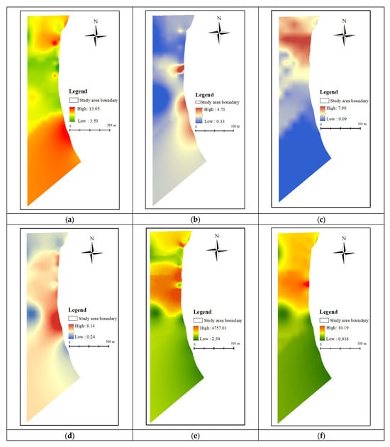 Thematic map of evaluation factors. (a) Aquifer thickness; (b) Gradation coefficients; (c) Marlstone thickness; (d) Permeability; (e) Grouting quantity; (f) Grouting termination pressure.