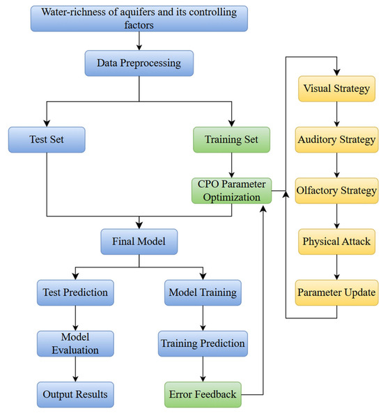 Aquifer water abundance prediction is divided into five steps: (1) First, drilling and geophysical survey data are collected. These data are then processed and analyzed to identify the key indicators for assessing aquifer water abundance; (2) The data for the water abundance factors were interpolated using the Ordinary Kriging method. This method employed a spherical variogram model, which was selected because it minimized the root mean square error in leave-one-out cross-validation, and a search neighborhood of 3 to 15 nearest points. Subsequently, the raster unit was designated as the evaluation unit. Finally, the spatial hierarchical structure of the evaluation indexes was constructed; (3) Aquifer water abundance is predicted using neural network models, such as the CPO-CNN-BiLSTM model; (4) The accuracy of different models is derived by comparing the predicted and actual values of unit water influx of aquifer; (5) This step applied the natural breaks classification method in ArcGIS 10.8 to zone the aquifer water abundance, utilizing both predicted and measured unit water influx values, enabling a direct comparative analysis of the outcomes. The research workflow is illustrated in Figure 3.