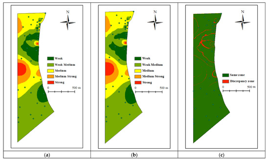 The fourth aquifer water abundance zoning after grouting. (a) Water abundance zoning based on CPO-CNN-BiLSTM hybrid model; (b) Water abundance zoning based on measured unit water influx; (c) Discrepancy in water abundance zoning.