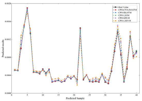 In the CPO-LSSVM model, CPO is used to optimize the coefficients and penalty coefficients of the Gaussian kernel function in the LSSVM [37]; In the CPO-KELM model, CPO is used to optimize the kernel parameters and penalty coefficients of the KELM [38]; In the CPO-LSTM model and CPO-BiLSTM model, CPO is used to optimize the number of hidden layer nodes, initial learning rate, and regularization factor of LSTM or BiLSTM. The prediction curves of the five prediction models are plotted against the proper value curves, as shown in Figure 9.