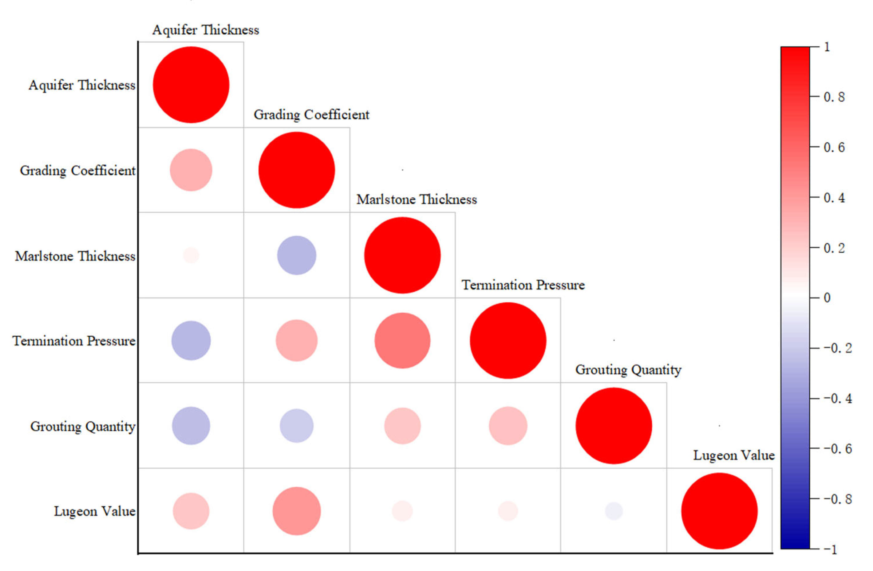 | Factors | Aquifer Thickness | Grading Coefficient | Marlstone Thickness | Termination Pressure | Grouting Quantity | Water Permeability |