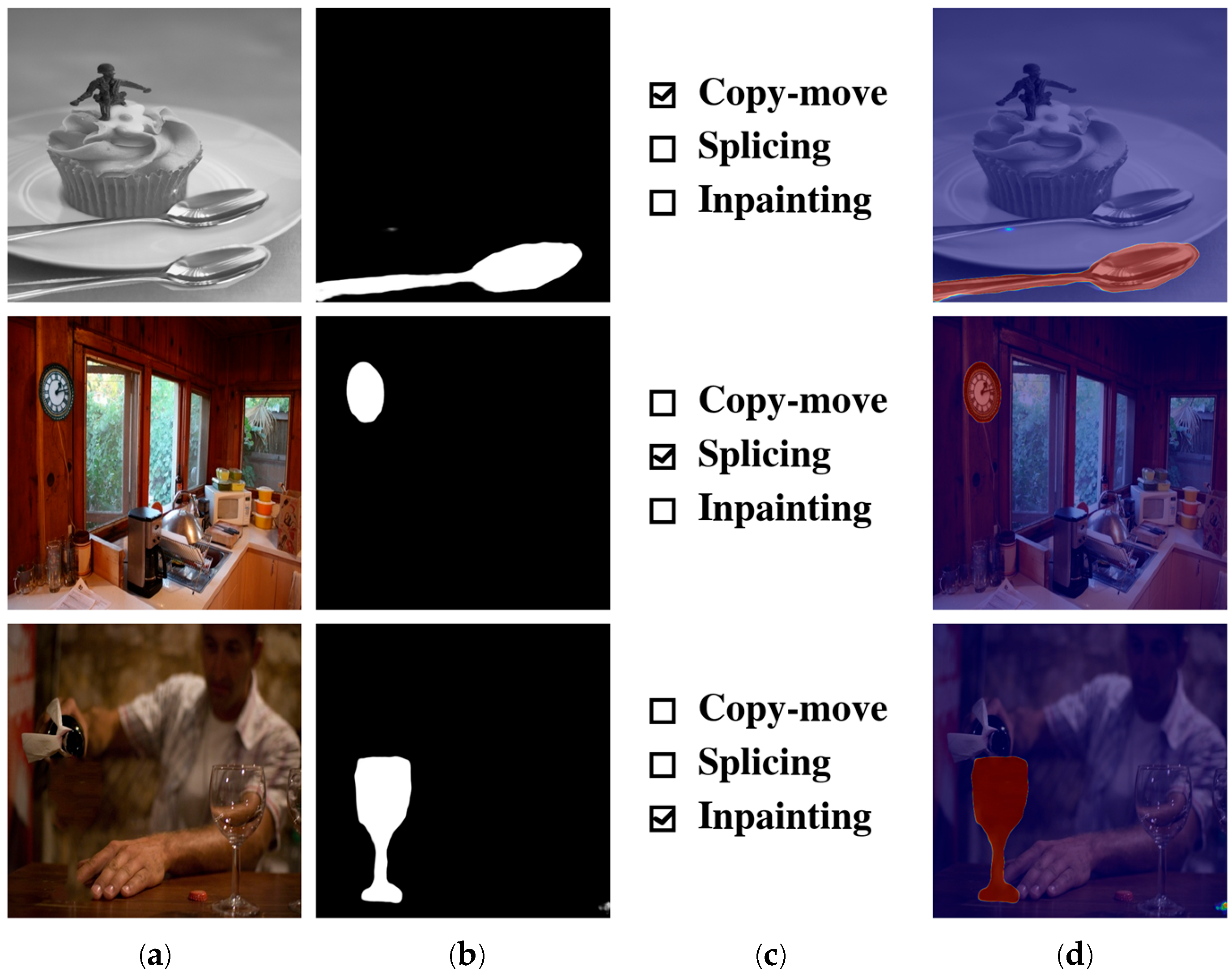 - Deb, P.; Deb, S.; Das, A.; Kar, N. Image forgery detection techniques: Latest trends and key challenges. IEEE Access 2024, 12, 169452–169466. [Google Scholar] [CrossRef]