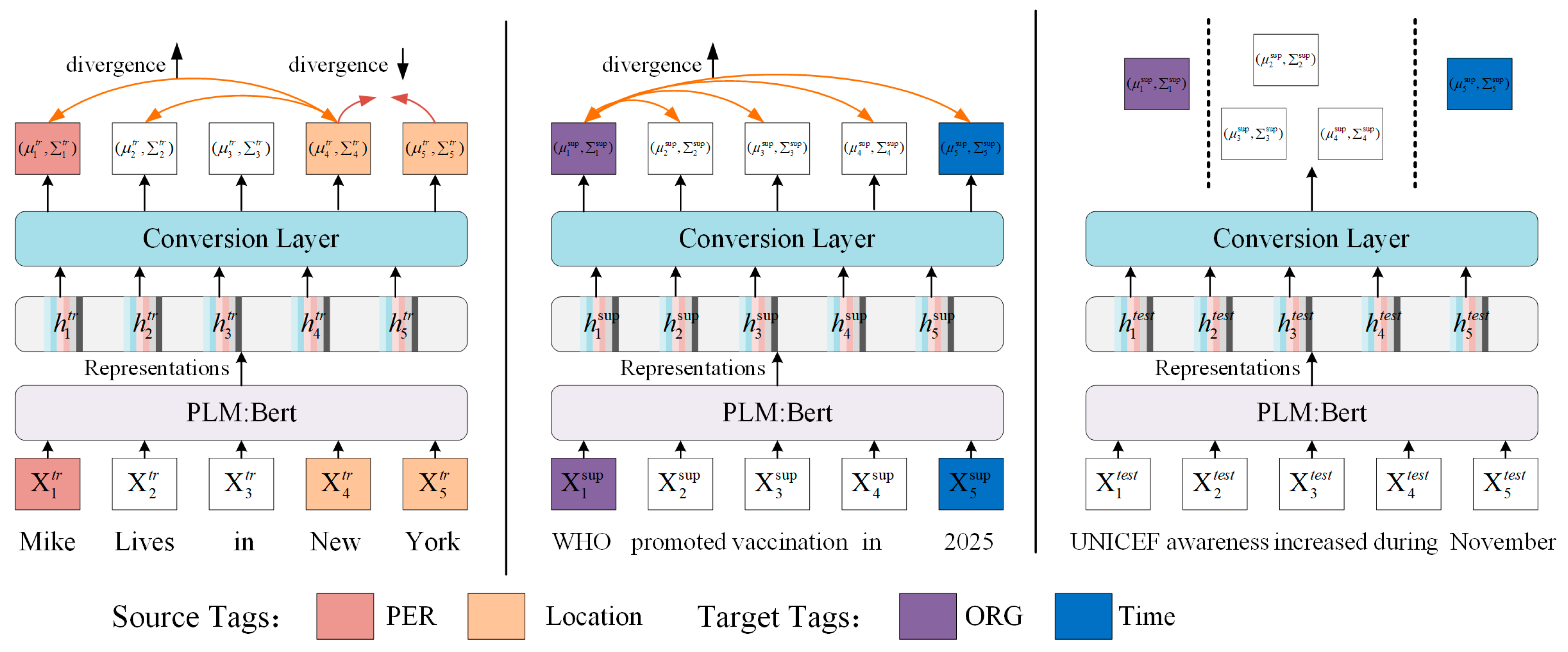 Contextual Refinement of Gaussian Distributions: The self-attention mechanism allows each entity’s Gaussian mean to be dynamically refined by aggregating information from all other tokens in the sequence. This process, formalized in Equations (2)–(6), generates a context-enhanced mean vector . For example, in the sentence “Apple is headquartered in Cupertino,” the token “Apple” could refer to either a fruit or the organization. The self-attention module can weigh the contextual significance of “headquartered” and “Cupertino,” thereby adjusting the Gaussian distribution of “Apple” towards the “ORG” class prototype. This results in more robust and context-sensitive distributional representations, which are crucial for the subsequent contrastive learning objective that relies on the distances between these distributions.