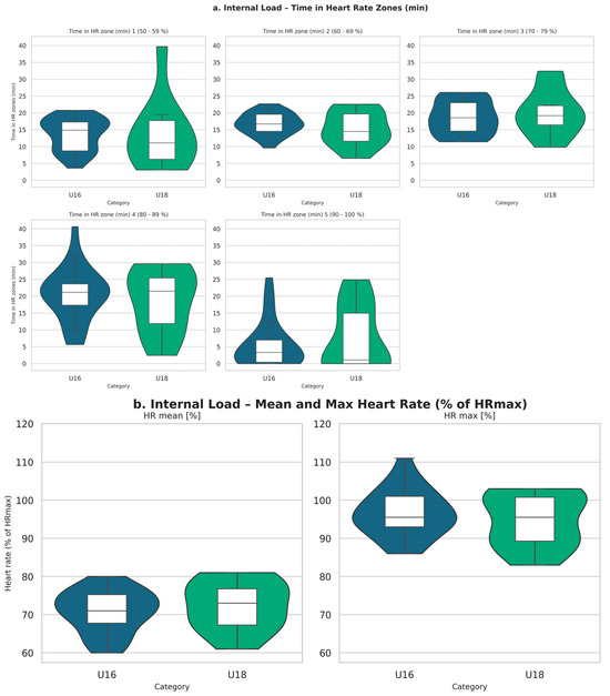 Figure 1 shows box and violin plots for internal loads in the U16 and U18 categories. Box and violin plots were used as they provide a clear visualization of the distribution, density, and central tendency of the data, which is particularly effective when comparing external and internal load demands between groups. There were no significant differences (p ≥ 0.05) between categories. We found greater values for U16 in the percentage of maximum heart rate (96.5 ± 6.15 vs. 94.7 ± 7.09, ES = 0.286), but lower values for U16 in the percentage of average heart rate (70.8 ± 5.51 vs. 72.3 ± 6.62, ES = −0.252), both with a small effect size. We found similar values for the U16 and U18 groups in the total number of minutes on each heart rate zone: zone 1 (50–60%) (13.5 ± 4.87 vs. 13.7 ± 10.80, ES = −0.022), zone 2 (60–70%) (16.6 ± 3.09 vs. 15.1 ± 5.22, ES = 0.400), zone 3 (70–80%) (18.5 ± 5.03 vs. 20.2 ± 7.04, ES = −0.292), zone 4 (80–90%) (20.4 ± 7.76 vs. 18.4 ± 9.62, ES = 0.237), and zone 5 (90–100%) (5.42 ± 6.92 vs. 7.40 ± 9.72, ES = −0.254). The effect size for all these variables was small.