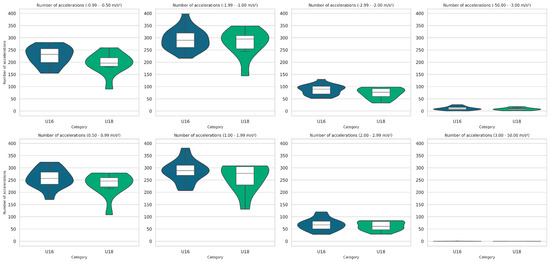 Figure 2 shows box and violin plots for external loads (accelerations and decelerations) in the U16 and U18 categories. There were no significant differences (p ≥ 0.05) between categories.