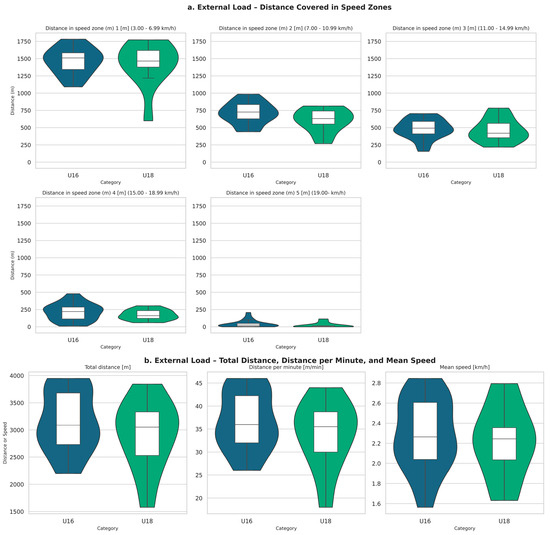 Figure 3 shows box and violin plots for external loads (speed and distances) in the U16 and U18 categories. There were no significant differences (p ≥ 0.05) between categories.