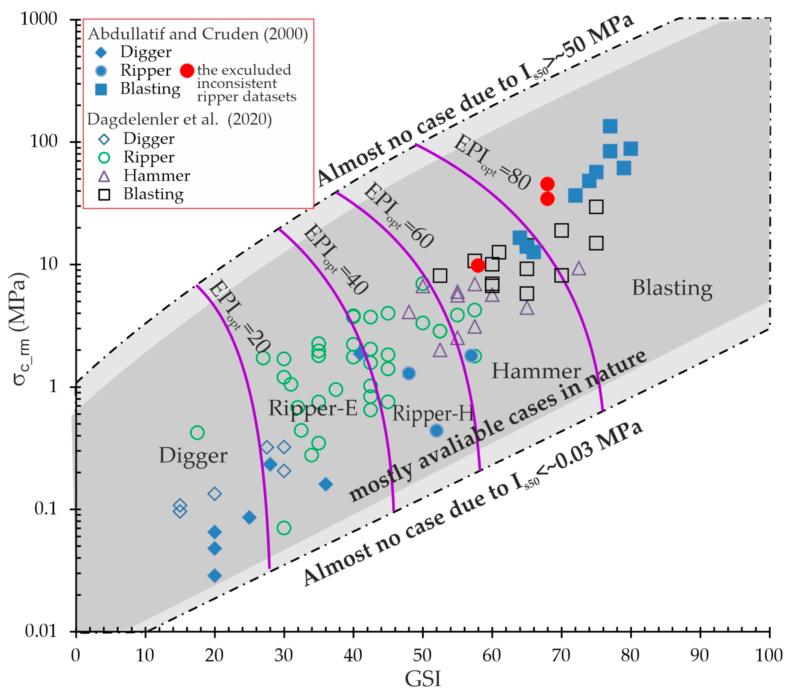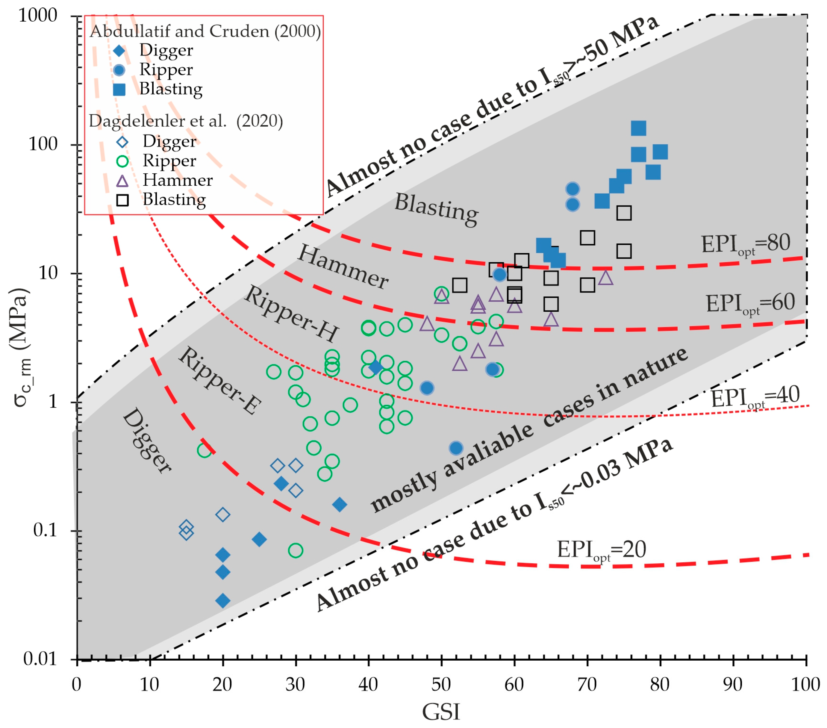 - Pettifer, G.S.; Fookes, P.G. A revision of the graphical method for assessing the excavatability of rock. Q. J. Eng. Geol. 1994, 27, 145–164. [Google Scholar] [CrossRef]