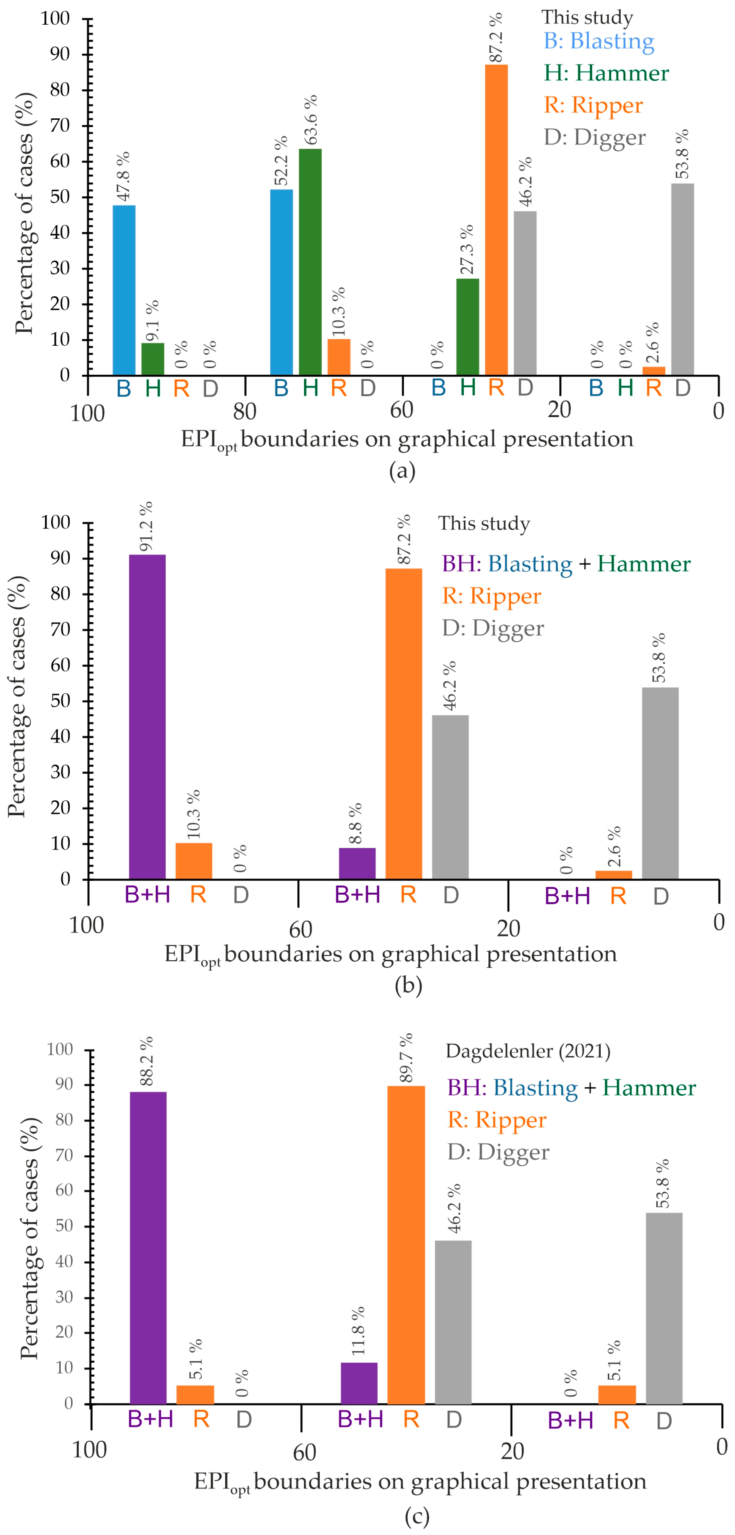 - Dagdelenler, G. Comparison of the efficiency evaluations of selected excavatability classifications for rock masses. Arab. J. Geosci. 2021, 14, 1281. [Google Scholar] [CrossRef]