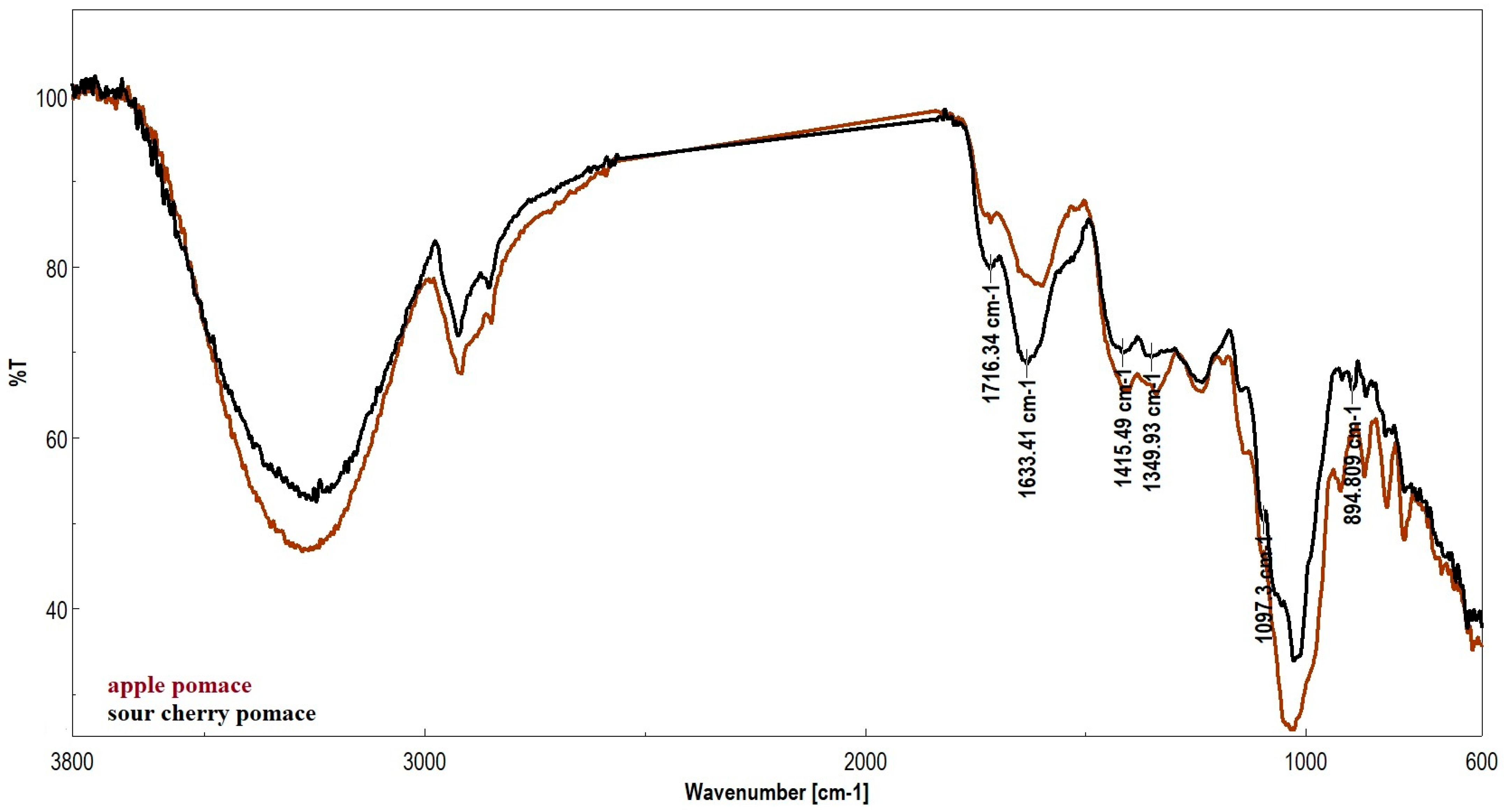 | 3278 | 3256 | –OH (Hydroxyl) | Stretching | Water, alcohols, polyphenols, cellulose, pectins |