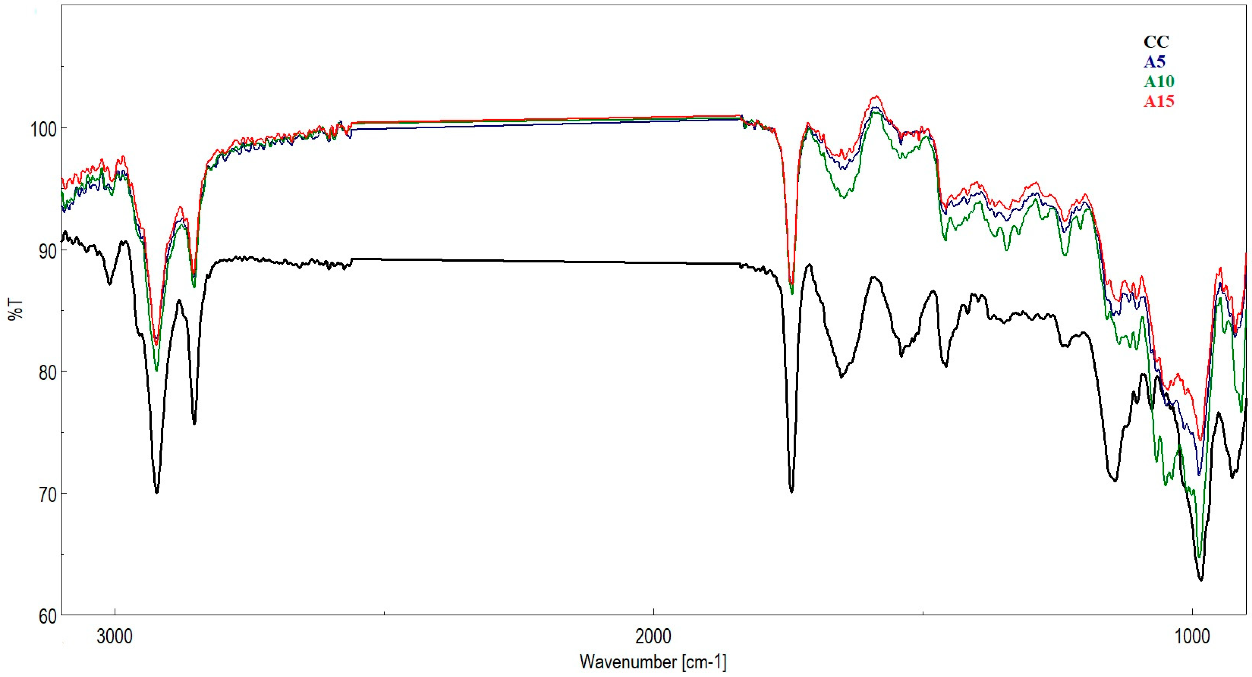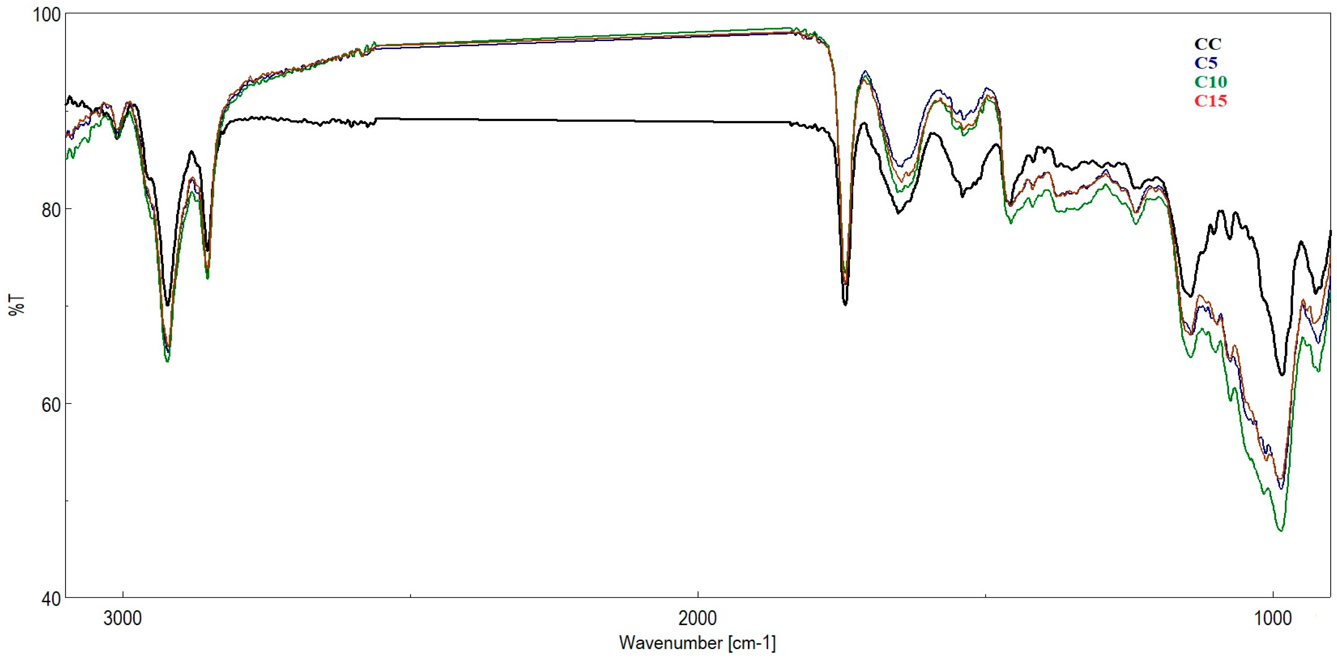 | 1236 1105 1026 | 1235 1097 1026 | C–O, C–O–C, C-O-C glycosidic bond | Stretching | Cellulose, hemicellulose, pectins, sugars |