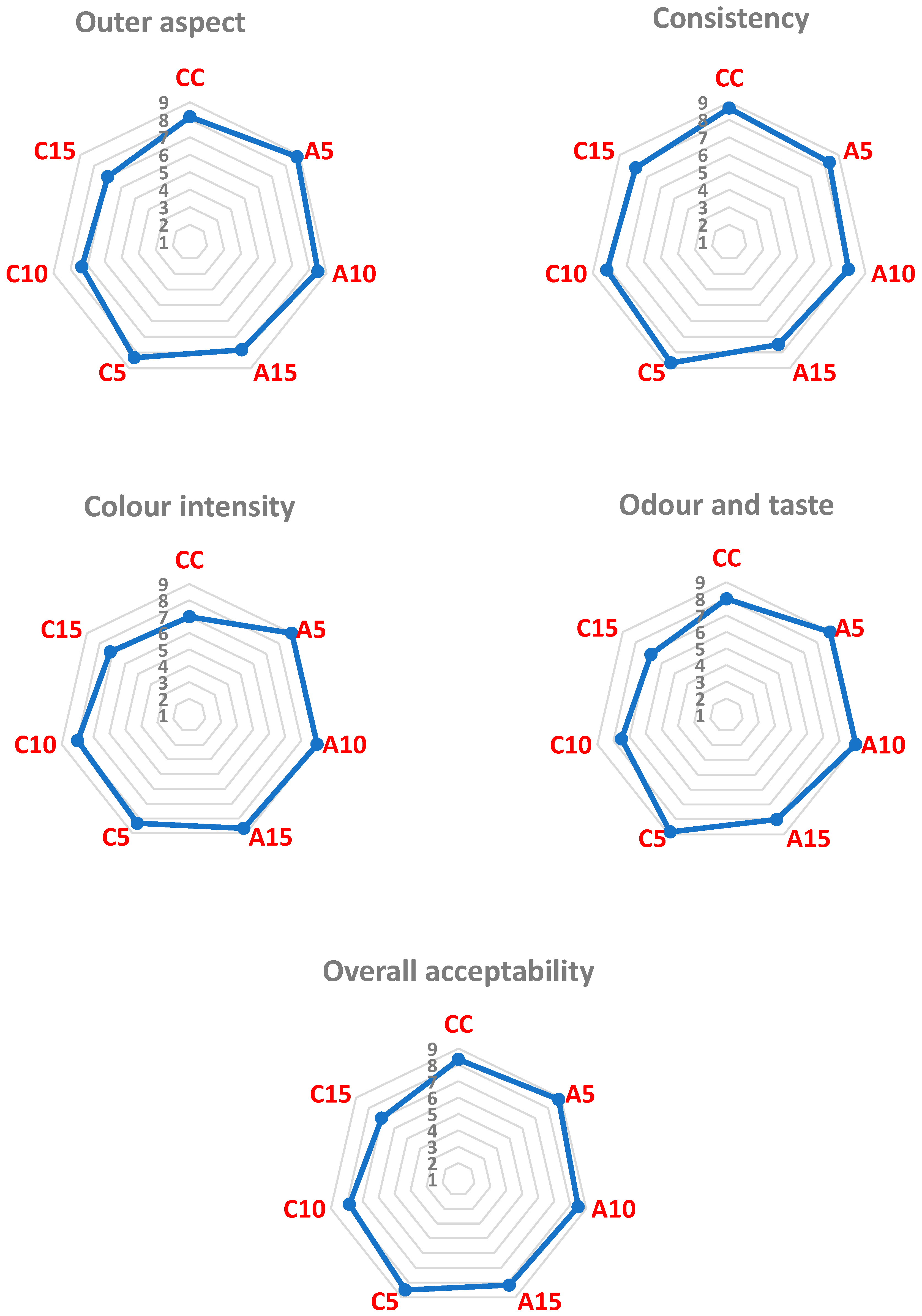 | 15% | 7.27 ± 0.80 a | 7.57 ± 0.31 d | 50.80 ± 0.36 f | 6.71 | |