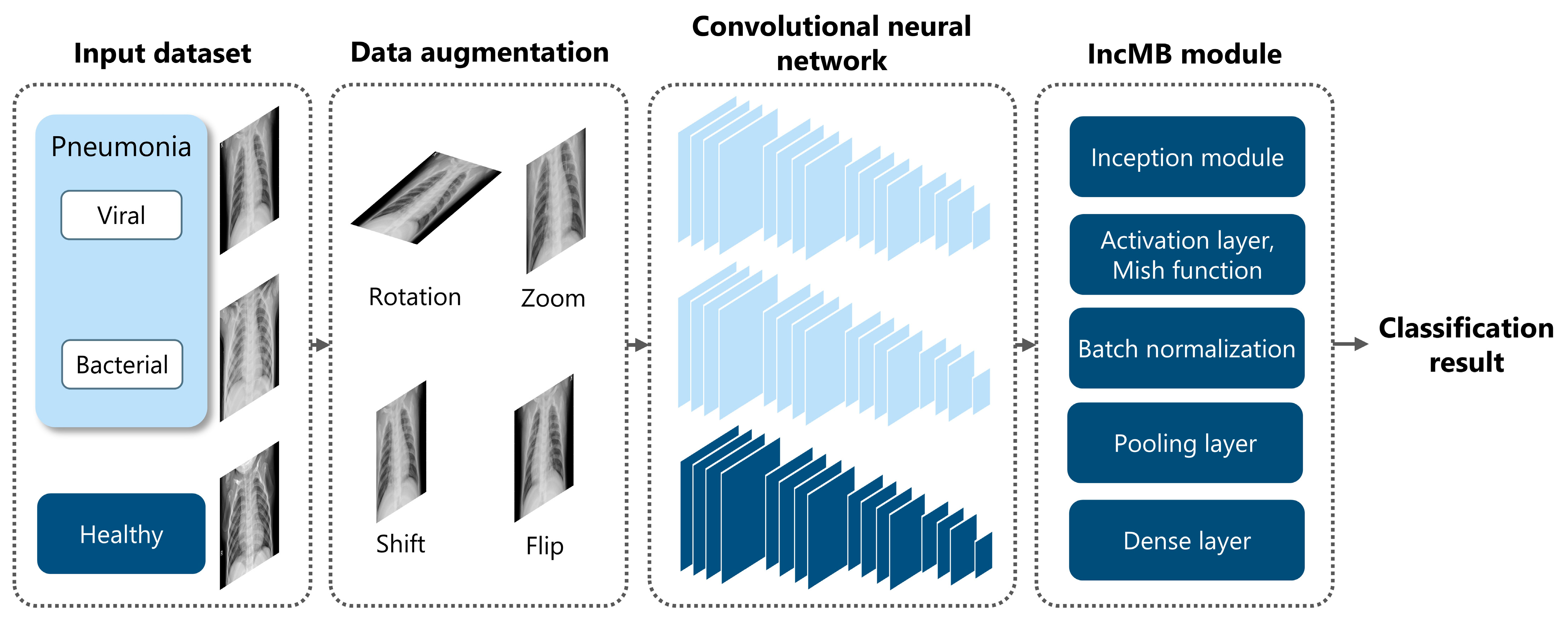 - This study adapts the IncMB module for grayscale pediatric chest X-ray analysis, overcoming the limitations of traditional CNNs designed for RGB images. By leveraging the Mish activation function for smoother gradients and Batch Normalization for robust regularization, the module achieves enhanced feature extraction in monochromatic medical images, improving pneumonia classification accuracy.