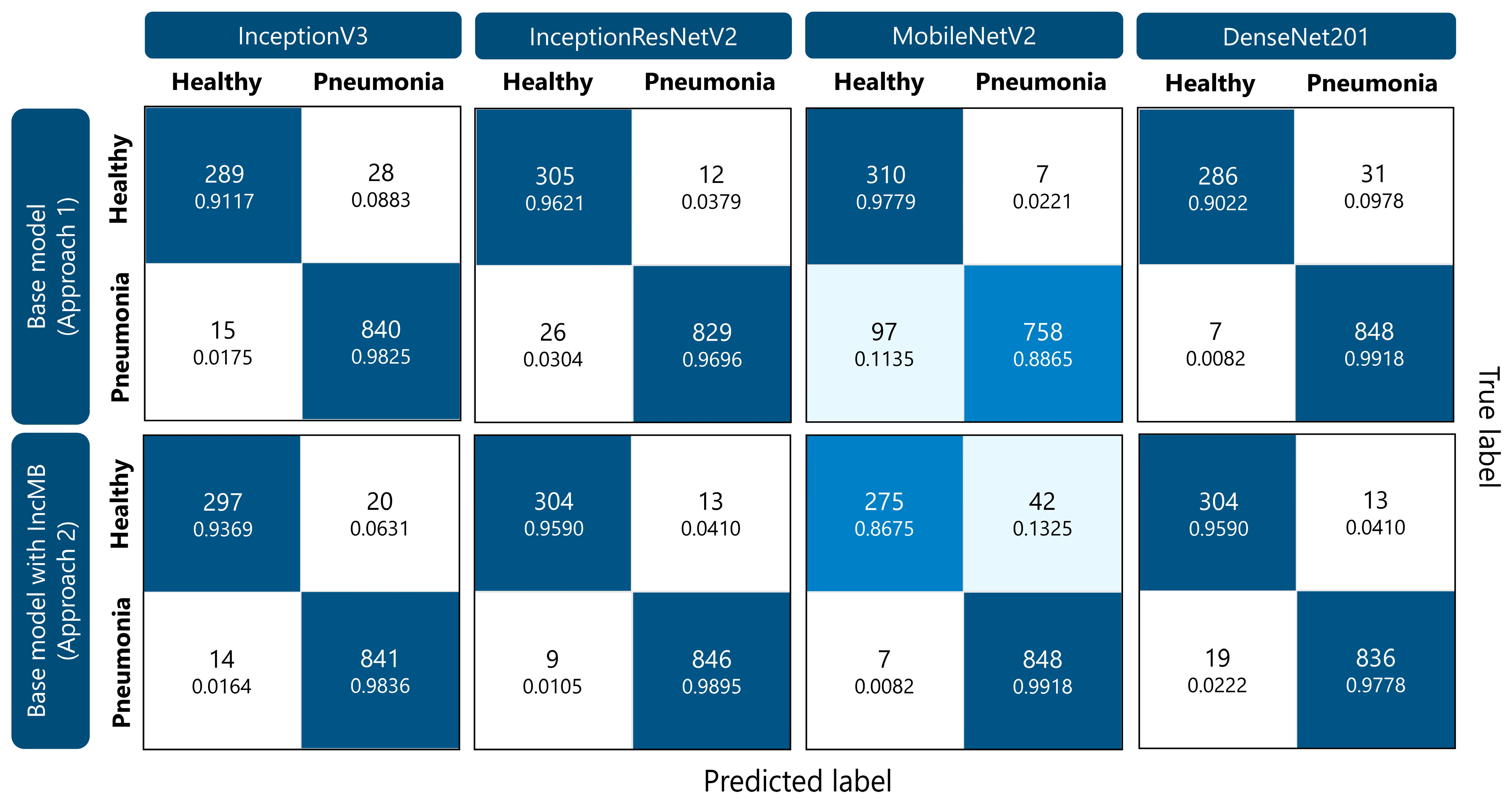 - This study rigorously evaluates the IncMB module’s integration into established CNN architectures on a publicly available pediatric CXR dataset, demonstrating its balanced trade-off between computational efficiency and diagnostic performance. The module’s design inherently reduces parameter growth compared to conventional multi-branch architectures while maintaining competitive accuracy.
