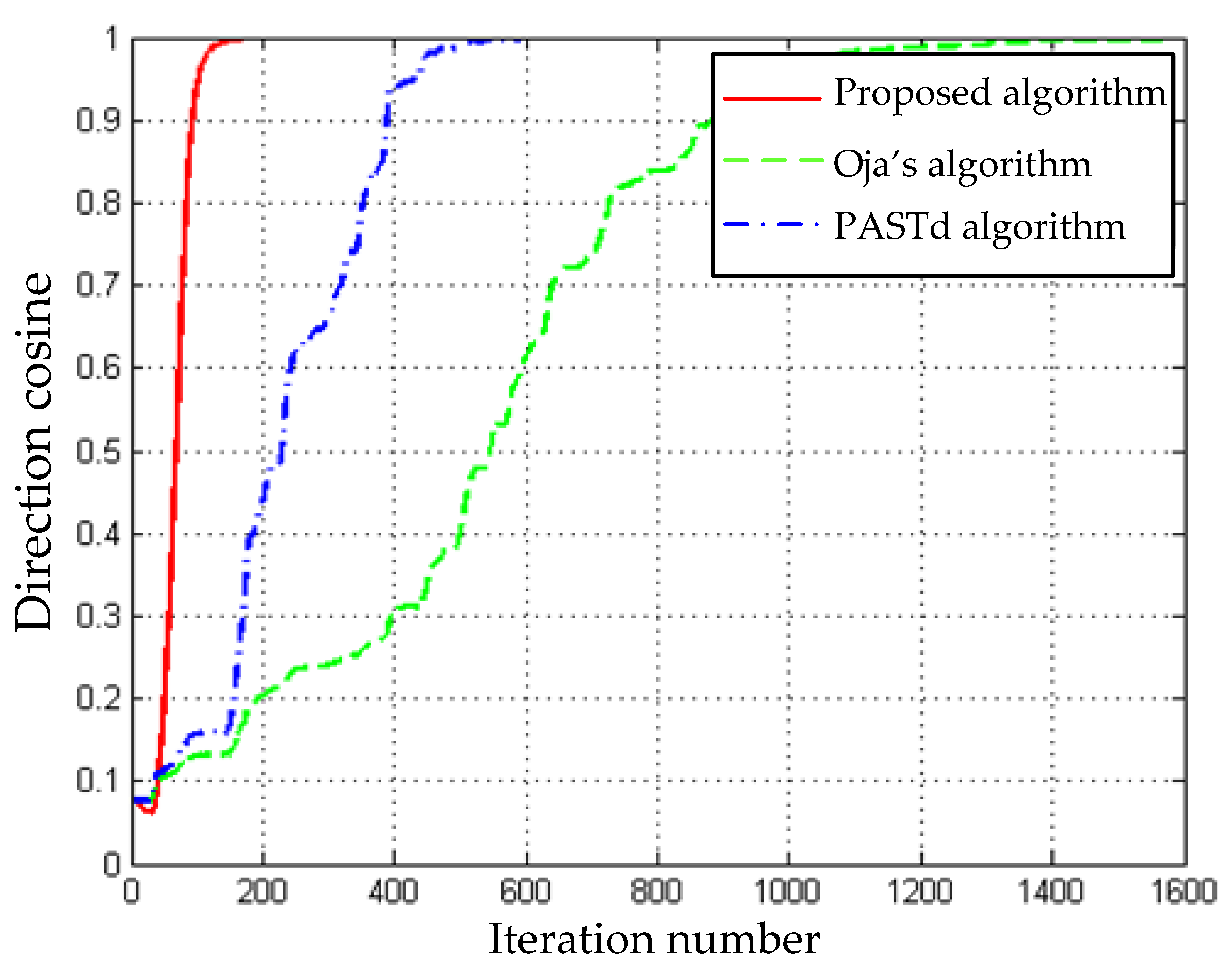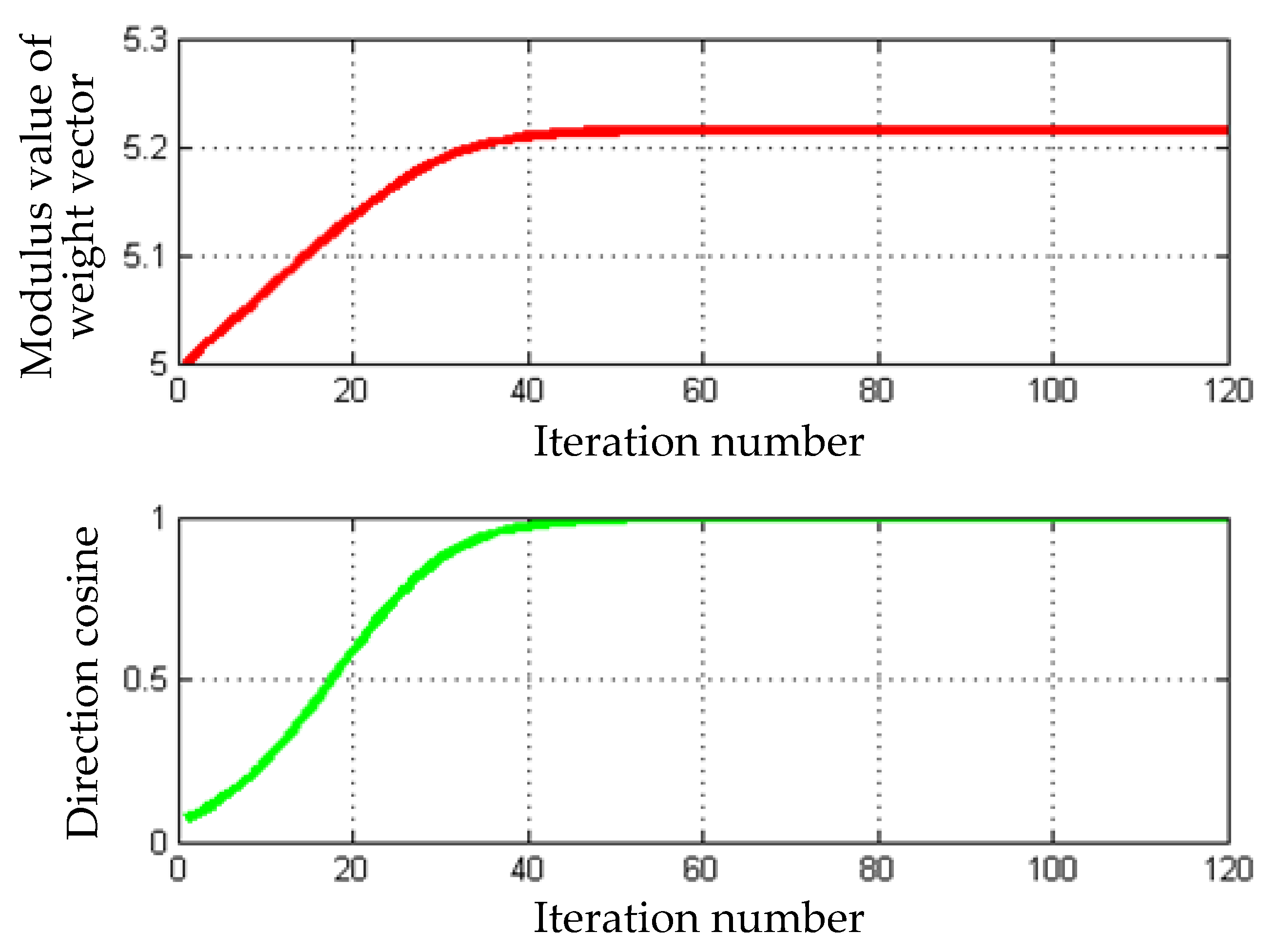 The maximum and minimum eigenvalues of the matrix are and , respectively, and its principal component is . The largest principal component of this autocorrelation matrix is estimated using the proposed algorithm (4). During the iteration process, the absolute value of the basis coefficients (i.e., ), the norm of the weight vector and the direction cosine are calculated.