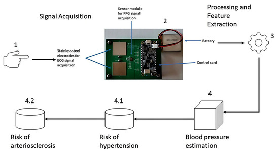 This section describes the acquisition of PPG signals [21], the analysis of the performance of traditional and assembled algorithms used for blood pressure estimation, the identification of hypertension risk, and the identification of arteriosclerosis risk.