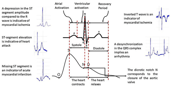 For this research, we decided to use PPG signals since the photoplethysmographic method consists of measuring the increase in volume in the cardiac pathways due to the passage of blood through the light absorbed or reflected by the tissues of the arteries, instead of using ECG signals because this signal represents the electrical activity of the heart, i.e., they are signals of different types; therefore, the PPG signal is the most appropriate for analyzing the arterial system [26]. Figure 2 shows the differences between the two types of signals.