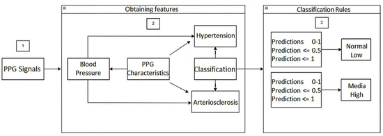 Once the PPG signals are obtained from the fingertips using the cardiac signal acquisition card (step 1), the PPG signal features (time, frequency, statistics, and time domain) of the first and second derivatives are obtained. Based on these features, blood pressure prediction, hypertension detection, and any risk related to arteriosclerosis are carried out (step 2). In step 3, for the detection of hypertension, classification rules were established based on the American standard of cardiology. For the categories normal, elevated, level 1, and level 2, i.e., the predictions were established with values between 0 and 1. In this way, if the prediction value is equal to or less than 0.5, the blood pressure value is classified as usual, otherwise if the prediction value is less than or equal to 1, it indicates a high probability of suffering from hypertension. Similarly, for the categories level 1 and level 2, classification rules were established, that is, the predictions were established with values between 0 and 1, so that if the value of the prediction is equal to or less than 0.5, the value indicates a level 1 probability of having hypertension; otherwise, if the value of the prediction is less than or equal to 1, it indicates a level 2 probability of having hypertension.