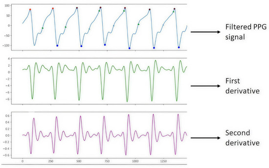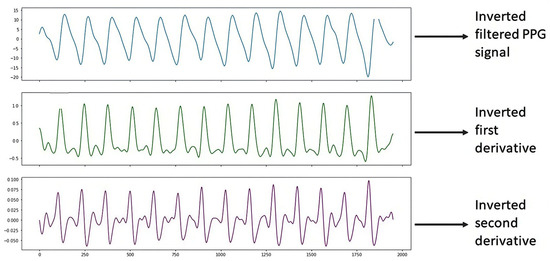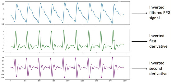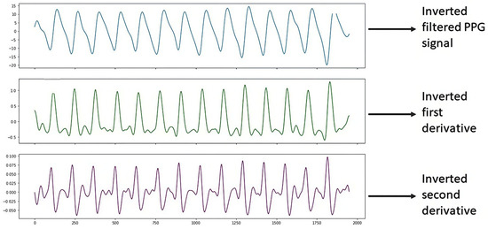 It is worth mentioning that once the S2 signal processing was performed, it was observed that the graph of the filtered PPG signal was shown horizontally upside down. This is since the Max86150 card, when collecting the PPG signals shows them upside down due to how the electronic devices and the PPG sensor of said card process the signals, due to design issues of the card. Therefore, we proceeded to carry out the programming in the Python 3 language with the help of Spyder version 5.4.1 software using a DELL Inspiron 3501 PC with an Intel Core i5 processor, NVIDIA GeForce 2 GB graphics card, 8 GB RAM, 1 TB hard drive, and a 64-bit operating system with Windows 10, to show the inverted PPG signal when processing it, which helped to correct the graphs of the filtered PPG signal and the graphs of the derivatives, as shown in Figure 6.