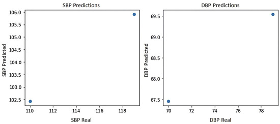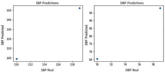 Figure 7 shows the blood pressure plot of the PPG signal of subject S2, where it can be seen that the system yields the two best predictions for blood pressure estimation, which are prediction 1:100 mmHg for systole and 66.5 mmHg for diastole and prediction 2:107 mmHg for systole and 71 mmHg for diastole, indicating in either case a normal blood pressure according to the blood pressure levels of the American standard of cardiology [29].
