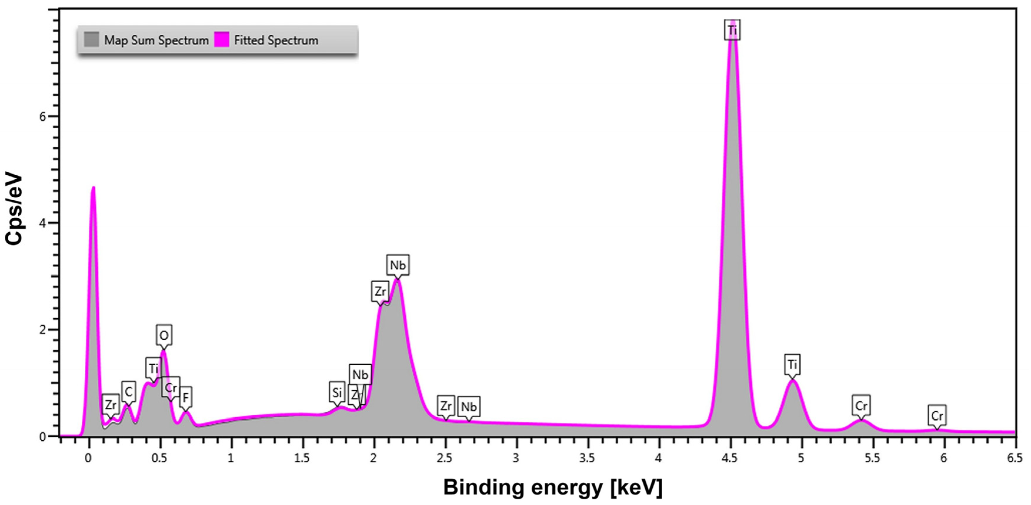 The presence of Zr (8.5 wt.%) and Nb (8.2 wt.%) in similar proportions but at lower contents compared to the original alloy composition confirms that the oxide layer formed during anodizing contains Zr and Nb, probably as mixed oxides of these metals with titanium oxide. A significant O content (36.0 wt.%) confirms the formation of an oxide layer. The incorporation of fluoride ions (3.2 wt.%) suggests that the electrolyte composition with the NaF additive, has influenced the chemical structure of the oxide layer. The inclusion of fluorine is significant, as it enhances bioactivity, antibacterial properties, and osteointegration, making the material particularly suitable for biomedical applications.