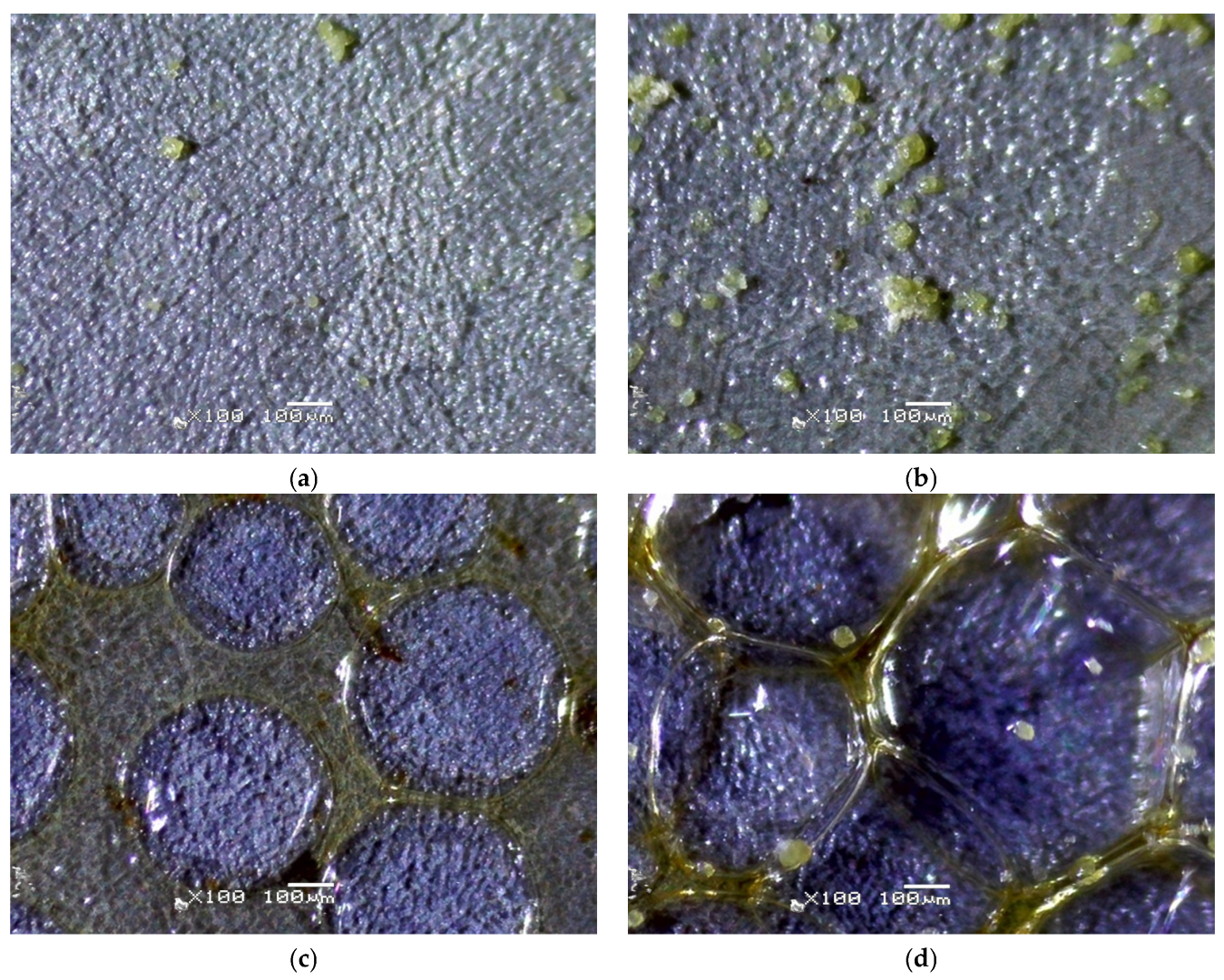 Figure 4d). There is a noticeable presence of polymerized or gel-like formations around particle clusters, indicating non-uniform surface coverage. The edge detection analysis reveals multiple fine irregularities along the surface, which could be micro-cracks or drying patterns. The presence of a significant defect area suggests possible delamination or impurity inclusion. The sample presents characteristic features of EPD, including interconnected structures and deposition in localized regions. The presence of polymeric films between the particles suggests incomplete drying or residual binder retention.