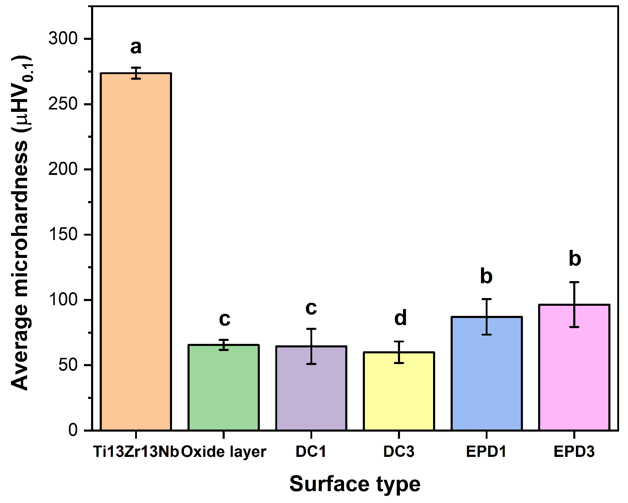 p = 0.43), suggesting that modifying EPD process parameters (e.g., deposition time) does not substantially affect hardness. The high variability in EPD3 results (SD = 17.18 µHV