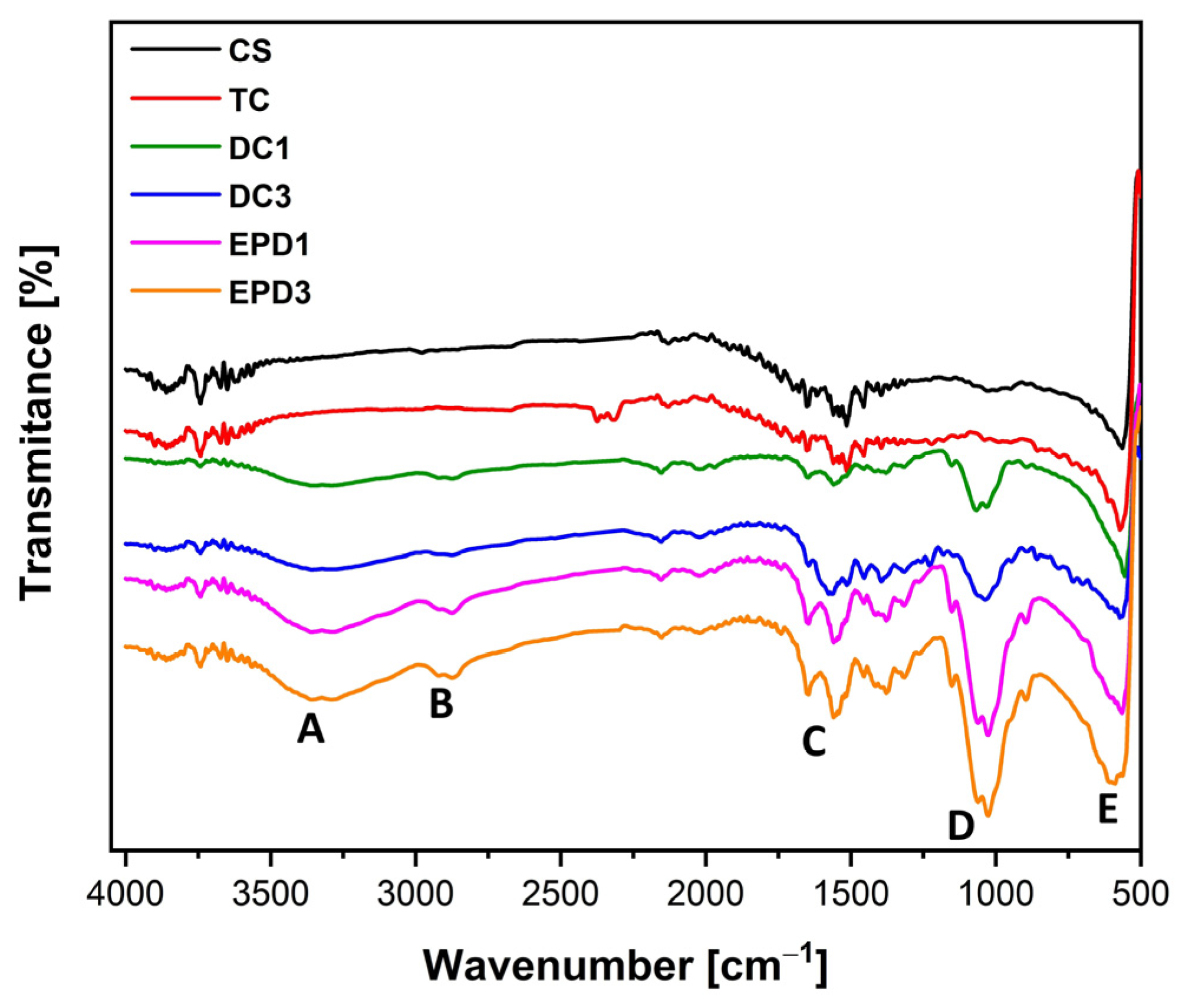 The ATR-FTIR spectra of six samples (CS, TC, DC1, DC3, EPD1, and EPD3 coatings) shown in