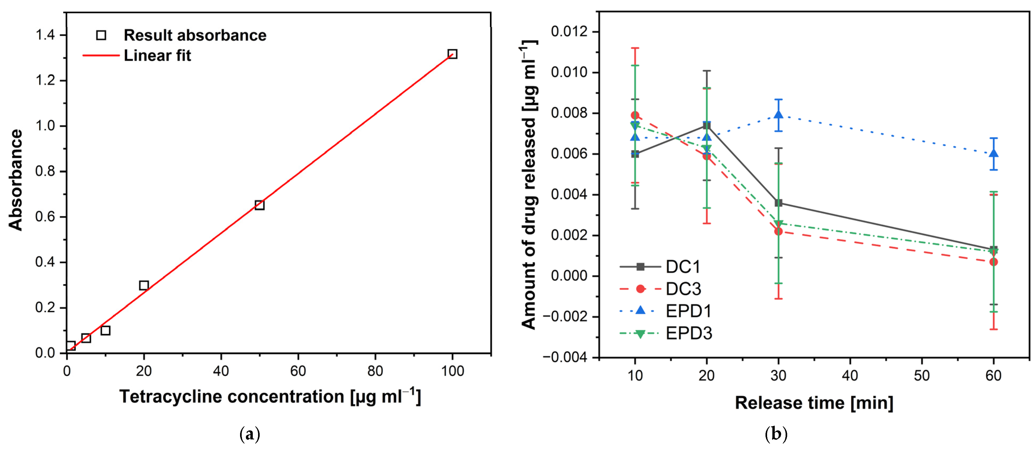 Drug release studies indicated that EPD coatings provide a sustained release of tetracycline over 60 min, while DCs exhibit a rapid initial release. This tunable release profile highlights the potential of EPD coatings for acute and medium-term therapeutic applications.