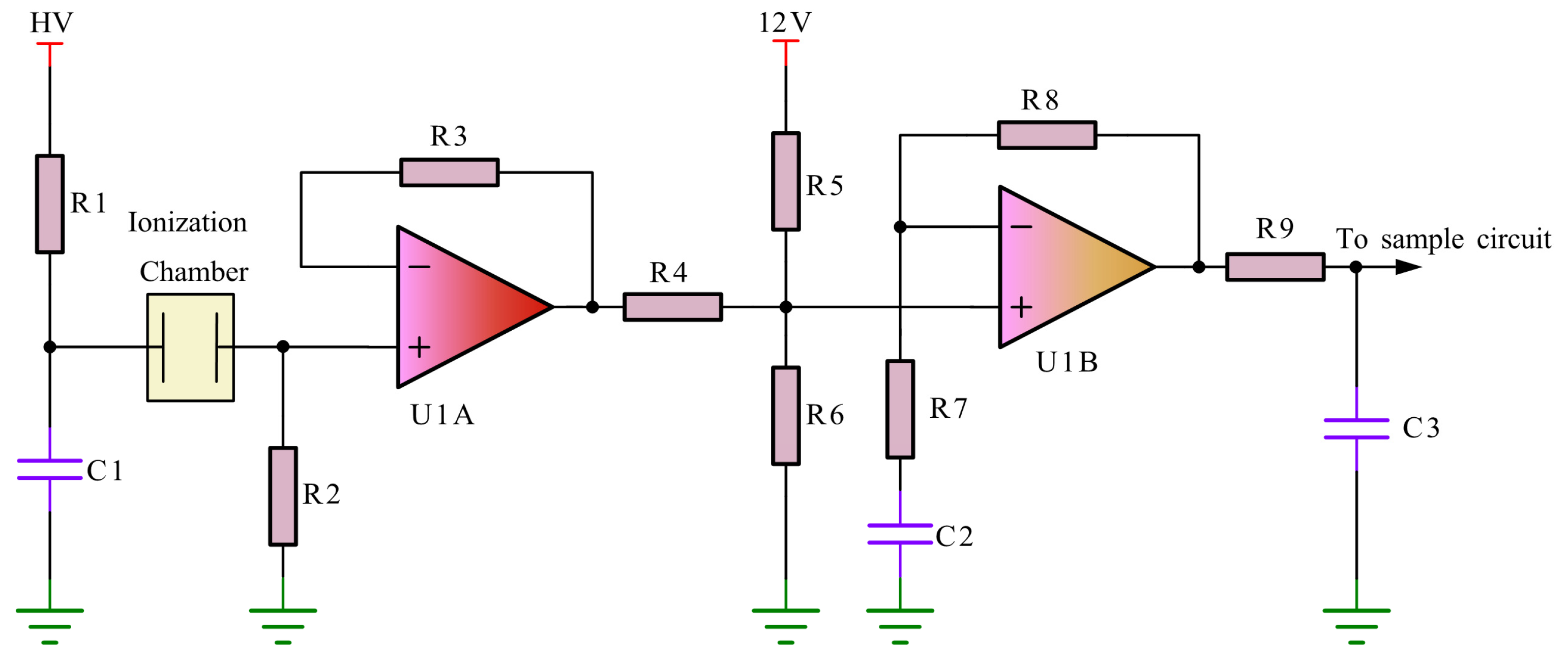The circuit is responsible for accurately measuring the small charge generated on the ionization chamber’s collector while minimizing noise and drift to ensure precise measurements. However, since the ionization charge formed on the collection electrode is very small, it is crucial to have a high input resistance in the charge collection circuit in order to accurately measure weak charge signals. Additionally, it is important to minimize noise and drift in order to ensure accurate measurements.