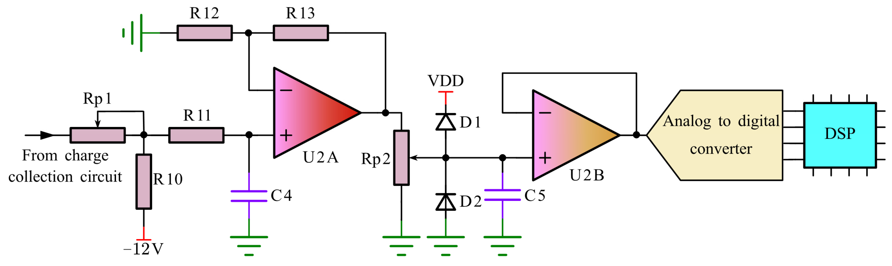 Figure 3, Rp1 and R10 create a negative bias circuit. This circuit provides a bias voltage that can be used to detect whether the ionization chamber is connected. If the ionization chamber is not connected, the input voltage in the circuit is pulled down to −12 V. This allows for the identification of the ionization chamber being offline after sampling. The bias voltage can be adjusted using Rp1. The biased signal is then filtered to remove any interference on the line. This is achieved through a filter composed of R11 and C4. The filtered signal is then output to the adjustable resistor Rp2 through a common-phase proportional amplifier U2A. Rp2 is used to manually adjust the attenuation value of the voltage. The attenuated voltage signal then passes through D1 and D2 limiters before being input into the analog-to-digital converter through the isolation buffer U2B. The limiters ensure that the signal output to the analog-to-digital converter is between −0.7 V and 4 V. The converted digital quantity is then transmitted to the DSP for further digital processing.