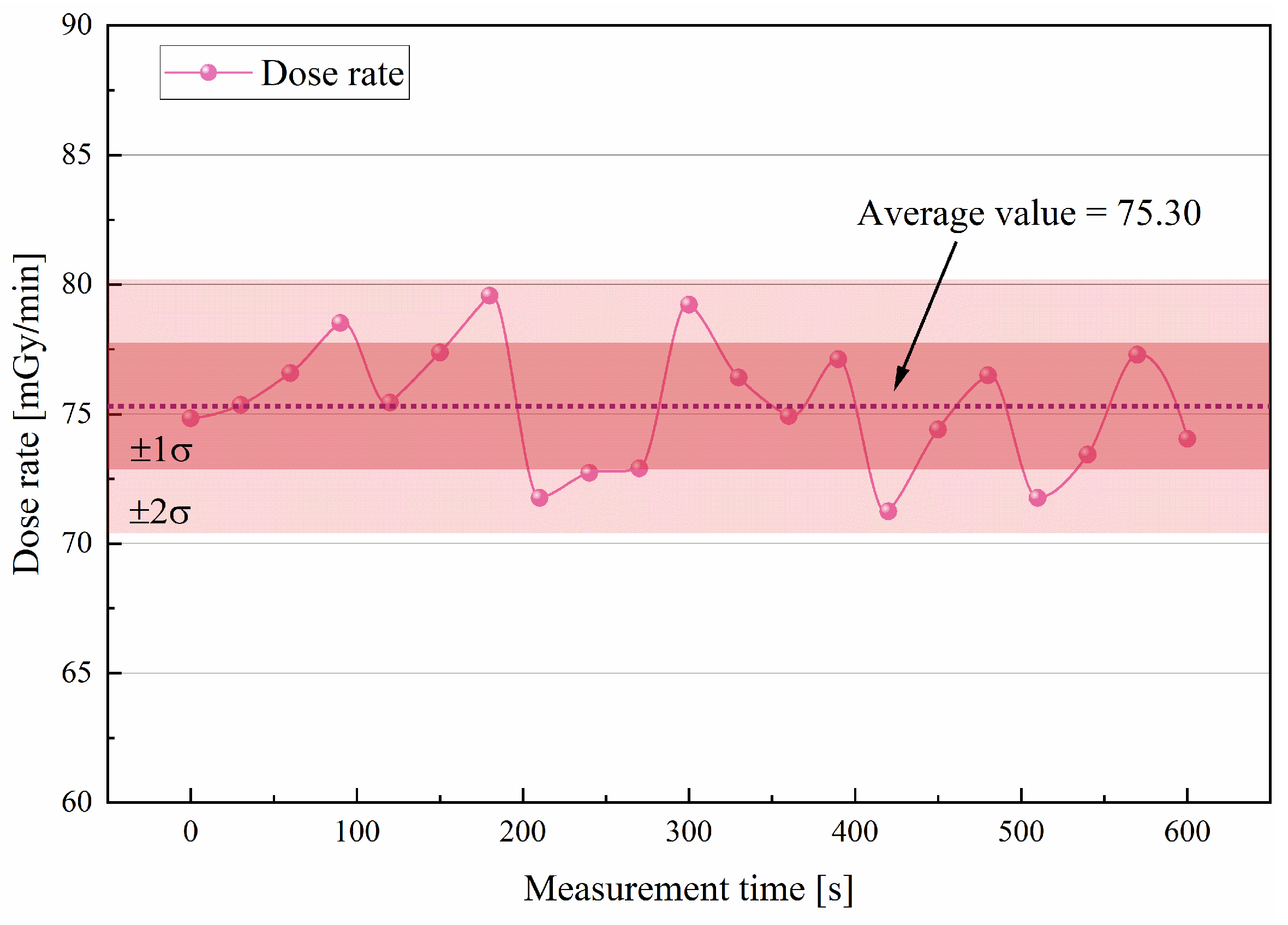 To assess the long-term stability of the ionization chamber, a stability test was conducted. Due to the direct air-cooling system used by the accelerator magnet, the accelerator can only operate continuously for a maximum of 10 min. During the test, the X-ray dose rate was recorded from the ionization chamber every 30 s. The results of the dose rate test are presented in
