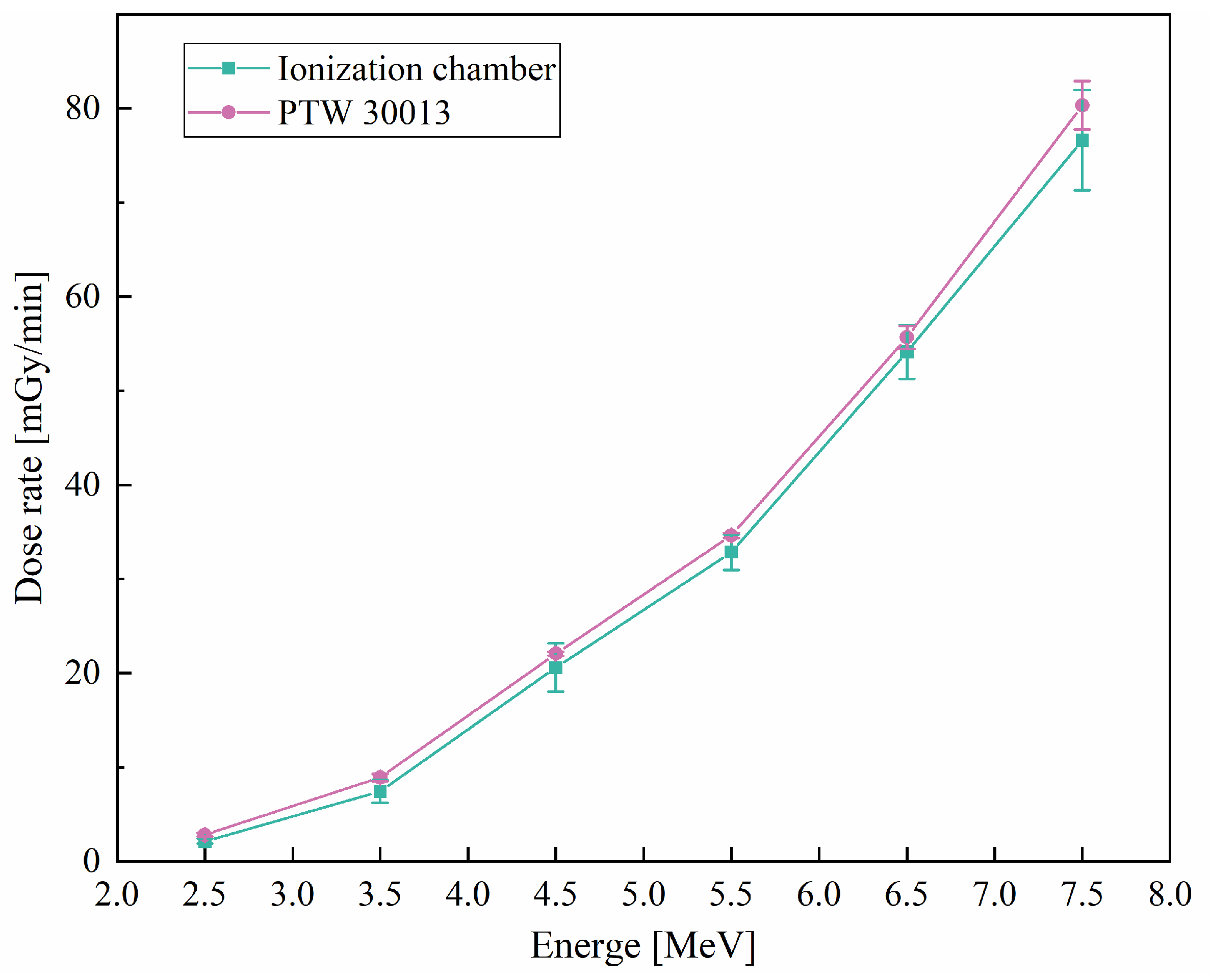 Figure 9, the dose rate generated by the accelerator increases gradually as the energy increases. The dose rate value exhibits a gentle nonlinear relationship with the X-ray energy. In the energy range of 2 MeV to 7.5 MeV, the proportion of Compton scattering and electron pair effect will vary. The close agreement between the experimental points and the fitted curve confirms that the chamber responds as theoretically expected across the energy range.