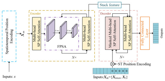 This paper proposes the SP-Transformer, a Transformer-based model that effectively captures the spatiotemporal dependencies among meteorological, geographical, and PV power data, aiming to improve the accuracy and efficiency of medium- and long-term PV power forecasting. The model architecture is shown in Figure 1.