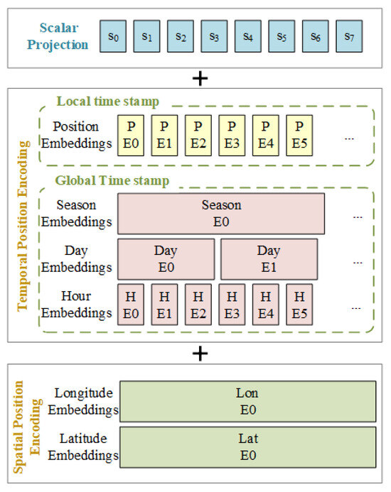 To enable the model to further extract the relative spatial position information of different photovoltaic (PV) sites, this study adds a spatiotemporal position encoding to the input sequence based on the aforementioned foundation. The spatiotemporal position encoding is composed of scalar projection, temporal position encoding (including local time stamp and global time stamp), and spatial position encoding, as illustrated in Figure 2. After the input sequence undergoes the spatiotemporal position encoding process, the input vector of the model is obtained, and the specific process is shown in Equation (1):