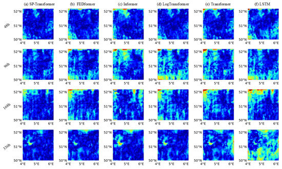The ablation experiment confirms the contribution of each proposed component. Model 1, using standard sequential encoding, was consistently outperformed by the full SP-Transformer, underscoring the importance of spatiotemporal position encoding in capturing geographic relationships for accurate medium- to long-term forecasting. Similarly, replacing the spatiotemporal probsparse self-attention mechanism in Model 2 reduced accuracy, validating its role in addressing data redundancy through selective focus on critical regions to enhance model adaptability. Finally, Model 3 exhibited performance degradation when its feature pyramid self-attention distillation module was replaced, demonstrating this module’s efficacy in reducing information loss and ensuring stability for robust long-term predictions.