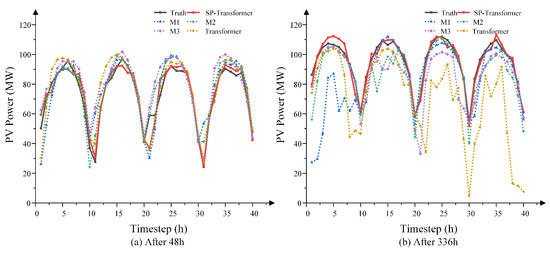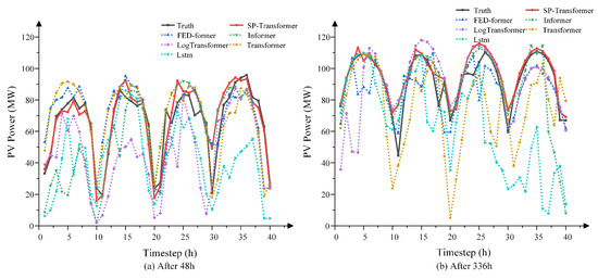 Ten random data sets were selected from the testing set to conduct experiments on each model, and the RMSE and MAE metrics were averaged over ten trials. From the data in Table 2 it is evident that the SP-Transformer outperforms the other methods. The RMSE for the SP-Transformer at 48 h is 0.761, which is 4.2% lower than that of FEDformer [26], 10.8% lower than Informer [25], 20.3% lower than LogTransformer [24], and 33.9% lower than Transformer [23]. The SP-Transformer demonstrates high prediction accuracy across all four prediction time steps, maintaining an RMSE of 1.061 at 336 h. Although this represents an increase in error compared to the 48-h prediction, the growth trend is steady and gradual, remaining lower than that of the other methods. Overall, the SP-Transformer achieves the highest accuracy in predicting photovoltaic power methods.