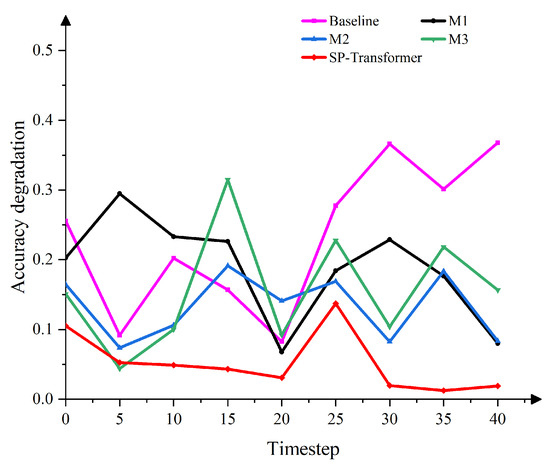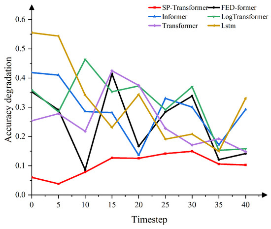 The RMSE values of the photovoltaic power prediction results from the aforementioned methods on the testing set are visually represented in Figure 4. From the figure, it can be observed that as the prediction time steps are extended, most models begin to exhibit significant deviations in their predictions. However, the SP-Transformer, utilizing the spatiotemporal probsparse self-attention mechanism, is better able to capture the spatiotemporal relationships between photovoltaic power and geographical as well as meteorological factors. By selectively focusing on regions that have a critical impact on the prediction task, the model enhances prediction accuracy and stability while maintaining a more efficient computational complexity. Consequently, compared to other models, the SP-Transformer demonstrates stable predictive performance across all time steps.