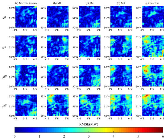 Model 2 achieved RMSE and MAE reductions of 16.9% and 23.3% (48-h) and 11.3% and 16.1% (336-h), demonstrating the efficacy of the spatiotemporal probsparse self-attention mechanism. By leveraging a combined Haverisine distance and KL divergence metric, the mechanism identifies the most contributive “active points” across spatiotemporal dimensions, thereby enhancing the capture of critical dependencies while improving computational efficiency.