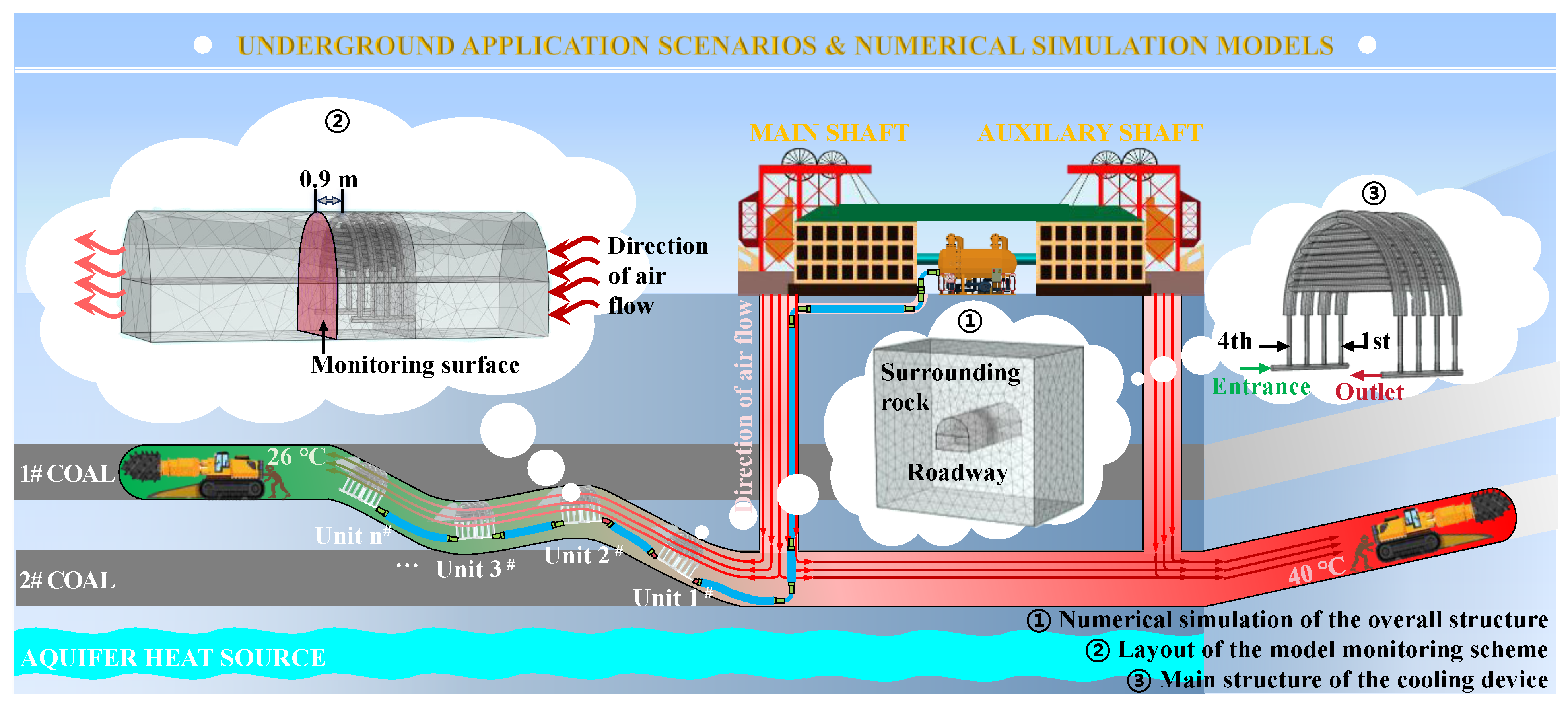7]. Consequently, developing novel technical equipment capable of simultaneously achieving efficient cooling and thermal energy recovery has become an urgent need in deep coal mining. Addressing deep mine heat hazard mitigation, existing research primarily follows two technical pathways. The first involves artificial cooling technologies dominated by mechanical refrigeration. While effective at controlling temperatures, their high energy consumption costs and “heat transfer rather than utilization” approach struggle to meet green mining development requirements [