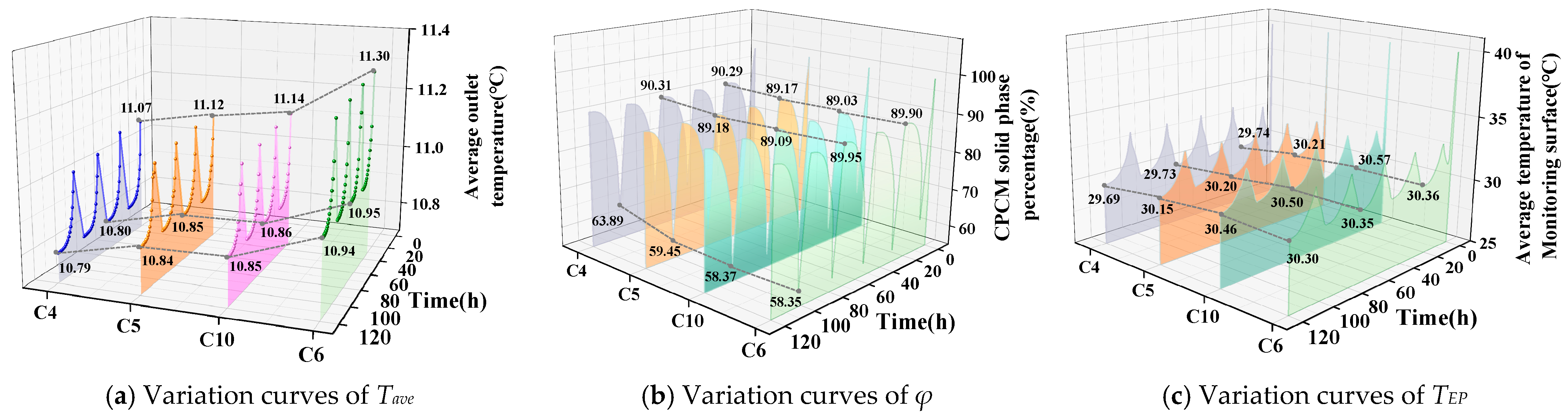 The study found that the average outlet temperature (Tave) shows little variation with increasing CPCM phase change temperature. In the initial stage of system operation, heat exchange within the tube is significant, and Tave changes rapidly. When the CPCM phase change temperature is 25 °C, Tave decreases from 11.14 °C to 10.85 °C during the pump operation phase on the second day, a reduction of approximately 0.29 °C. When the CPCM phase change temperature increases from 25 °C to 31 °C, Tave exhibits minor fluctuations before heat exchange, rising from 11.14 °C to 11.2 °C before stabilizing. After heat exchange occurs, Tave remains stable, ultimately settling between 10.85 °C and 10.87 °C for all cases. The solid phase percentage of the CPCM (φ) increases with higher CPCM phase change temperatures, while the phase change utilization rate decreases. The cooling effect is most significant when the CPCM phase change temperature is relatively low, as the phase change occurs most fully under these conditions. At a CPCM phase change temperature of 25 °C, the range of φ is largest, with a maximum of 33.65% and a minimum of 30.78%, indicating the highest overall phase change utilization rate. Within the 5-day operation period, φ can recover up to 89.23%. In contrast, at a CPCM phase change temperature of 31 °C, the range of φ is significantly smaller, with a maximum of 12% and a minimum of 11.09%, and φ can recover up to 99.64%. However, compared to other schemes, the comprehensive utilization rate of the CPCM is lowest at this temperature. As the CPCM phase change temperature increases, the range of the average monitoring surface temperature (TEP) becomes larger. Lower CPCM phase change temperatures lead to faster TEP reduction rates, but the final stabilized TEP after cooling is higher. The maximum temperature differences of TEP within the fifth day for CPCM phase change temperatures of 25 °C, 27 °C, 29 °C, and 31 °C are 2.69 °C, 3.38 °C, 3.85 °C, and 4.46 °C, respectively. A lower CPCM phase change temperature results in a more balanced TEP distribution. At a CPCM phase change temperature of 25 °C, TEP after 5 days of operation is 30.46 °C, with a cumulative temperature reduction of 9.54 °C. The difference in the final TEP compared to the case with a CPCM phase change temperature of 31 °C is only 0.18 °C.