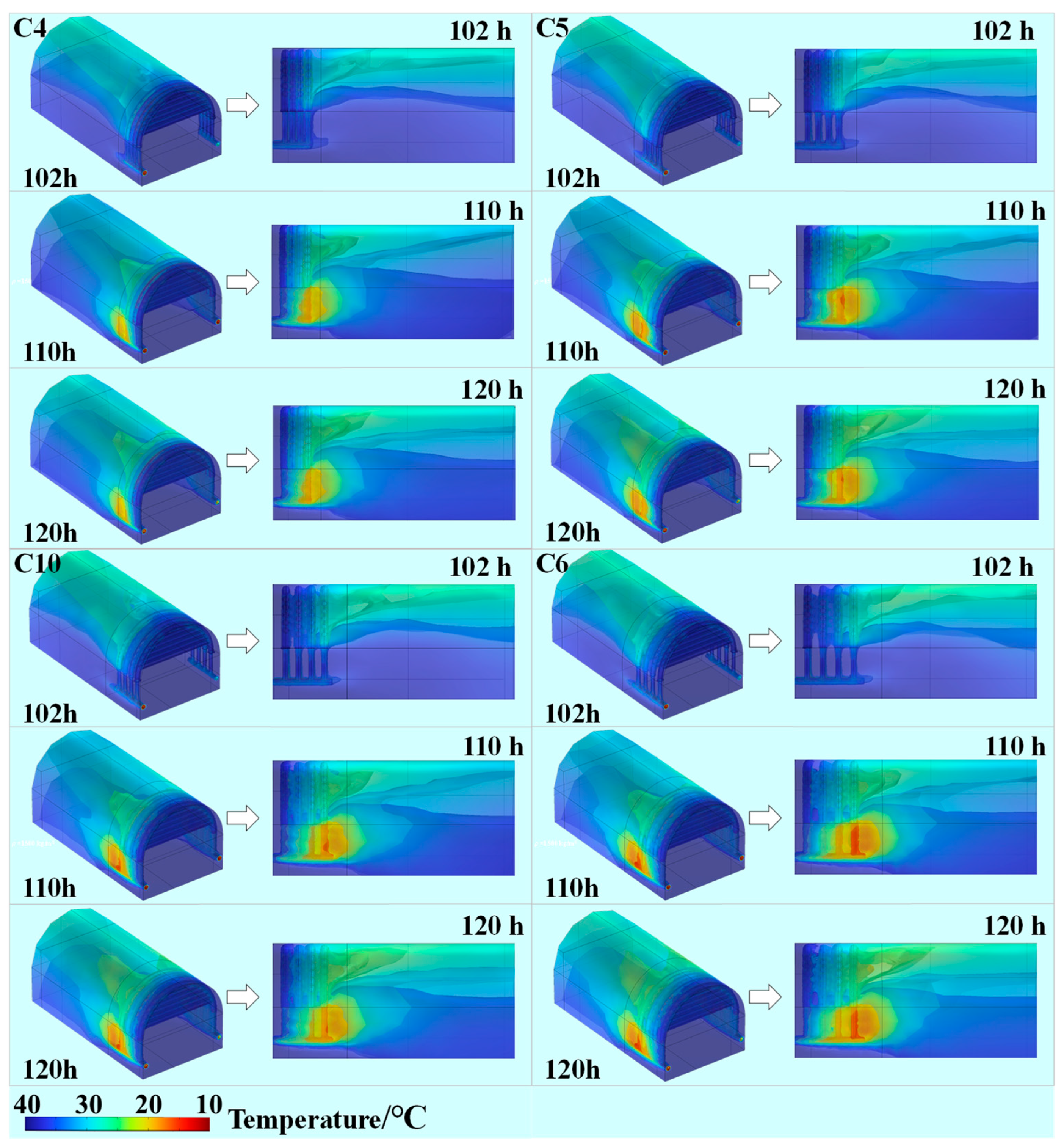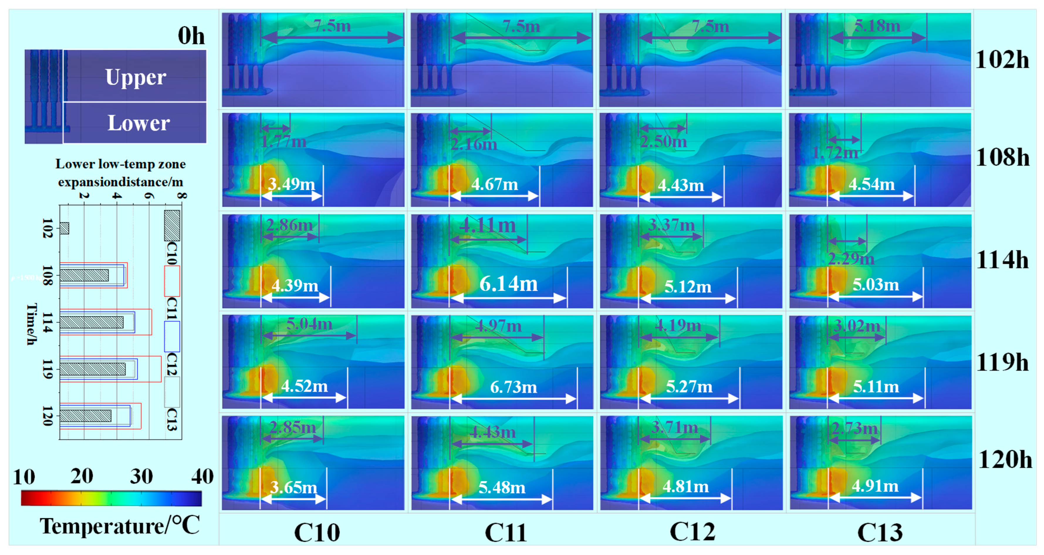 Figure 11, the deflector structure improved the delayed cooling effect in the lower section without weakening the cooling effect in the upper section, while further reducing the temperature in the space behind the deflector. At 108 h of operation, the expansion distances of the lower low-temperature zone for the different deflector schemes (C11, C12, C13) increased by 33.81%, 26.93%, and 30.09%, respectively. By 114 h, the expansion rate of the C12 group compared to the C13 group increased by 0.03 m per hour relative to the rate at 108 h. The expansion distance of the lower low-temperature zone for the C11 group was 6.14 m. At 119 h, the expansion distances of the lower low-temperature zone for all schemes reached their optimal values: 4.52 m, 6.73 m, 5.27 m, and 5.11 m, respectively. The enhancement effect of the deflector schemes on the expansion of the lower low-temperature zone was significantly superior to the configuration without a deflector. At 120 h, after the pump stopped, the roadway temperature partially recovered, but both the cooling effect and the ability to delay high-temperature recovery were better in the deflector-equipped groups than in the configuration without a deflector. Therefore, the influence of different deflector angles on the cooling effect can be summarized as follows: The cooling effect in the lower roadway section initially improves and then diminishes with increasing deflector angles but remains superior to the configuration without a deflector. The deflector structure not only effectively enhances cooling in the lower section and mitigates its delayed effect but also does not weaken the cooling effect in the upper section. Additionally, it significantly slows down the temperature recovery rate in the roadway after the pump stops.