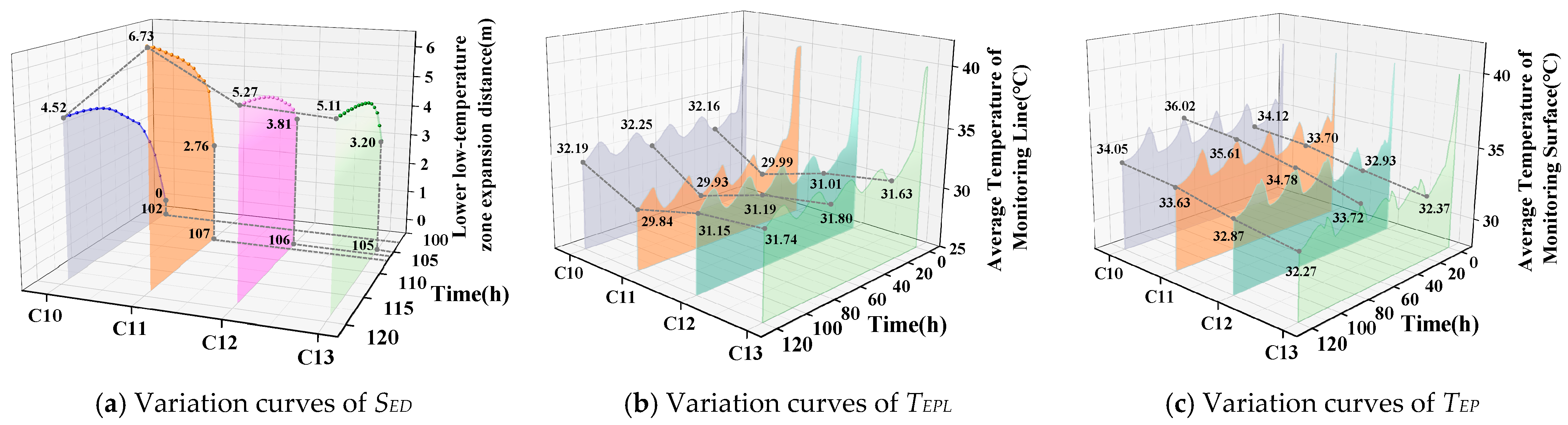The study found that the growth rate of the lower low-temperature zone expansion distance (SED) initially increases and then decreases as the air deflector angle increases, peaking at a deflector angle of 30°. When no deflector was installed (C10), the roadway remained in a high-temperature environment at the 102 h cooling mark. As pump operation time extended, the SED eventually expanded to 4.52 m. After installing deflectors (C11, C12, C13), the cold airflow path was altered. In the initial cooling stage, the low-temperature zone, obstructed by the deflector structure, first concentrated in the space beneath the deflector, significantly reducing the local temperature and improving the high-temperature environment. Subsequently, the low-temperature zone began to expand, with an earlier expansion onset correlating to larger deflector angles. At a 90° deflector angle, the lower roadway’s low-temperature zone started expanding at 105 h, with an initial SED of 3.20 m. The maximum expansion distances for the lower low-temperature zone in groups C11, C12, and C13 were 6.73 m, 5.27 m, and 5.11 m, respectively. After deflector installation, the cooling effect in the space behind the deflector significantly enhanced. When deflector angles were 30°, 60°, and 90°, the TEPL values were all lower than those of the C10 scheme (no deflector). While improving the delayed cooling effect in the lower roadway, the cooling amplitude in the upper roadway further increased. The TEPL decreased first and then increased with larger deflector angles, reaching the maximum cooling at a 30° deflector angle. At the end of pump operation on the first day, the TEPL values for schemes C10 (no deflector), C11 (30°), C12 (60°), and C13 (90°) were 32.16 °C, 29.99 °C, 31.01 °C, and 31.63 °C, respectively. By the end of pump operation on the third day, the cooling rate of TEPL continuously decreased with increasing deflector angles, with the C13 group showing only a 0.45 °C improvement compared to the C10 group. At a 30° deflector angle, after 120 h of system operation, the TEPL was 29.84 °C, indicating a significantly enhanced cooling effect compared to the setup without a deflector, with a total reduction increase of 2.35 °C by the end of the operation period. The cooling effect at the monitoring surface location improved with larger deflector angles. After deflector installation, the flow path of the low-temperature zone changed, leading to a further reduction in the average monitoring surface temperature (TEP). At the end of pump operation on the first day, the TEP values at the locations for groups C10, C11, C12, and C13 were 34.12 °C, 33.70 °C, 32.93 °C, and 32.37 °C, respectively. When the pump stopped on the fourth day, the temperature recovery was highest for the C10 group (no deflector) at 36.02 °C. By the end of the system operation period, the TEP reductions for the different groups were 5.95 °C, 6.37 °C, 7.13 °C, and 7.73 °C, respectively, demonstrating that the cooling effect strengthens with increasing deflector angles.