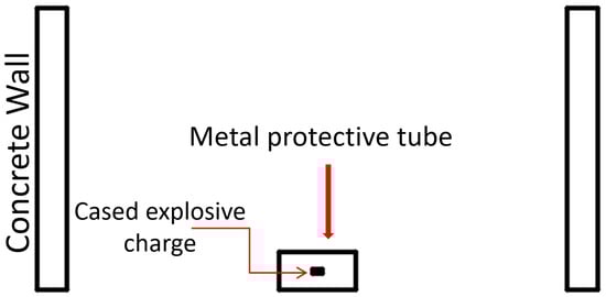 Experimental setup for detonation of a steel-cased cylindrical charge in a protective metal tube placed between two concrete walls.