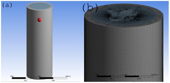 Ansys Explicit Dynamics model of an improvised explosive device based on a steel cylindrical case filled with C4 explosive. (a) The red ball represents the detonation point. (b) Discretisation of the model geometry.