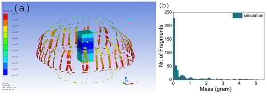 (a) Ansys modelling of fragmentation process. The legend describes the absolute velocity of fragments in the limits between m/s—blue colour to m/s—red colour; (b) mass distribution of the fragments resulting from Ansys modelling.