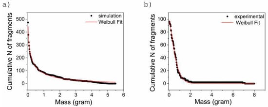 Cumulative fragment number vs. mass generated by (a) simulation and (b) experiment. In red is shown the Weibull distribution function in each case.